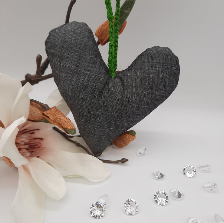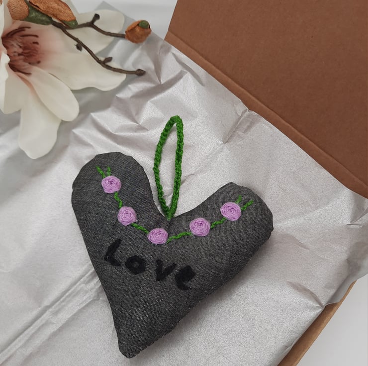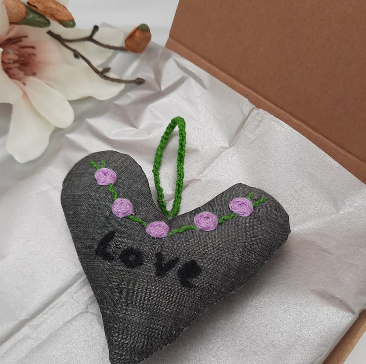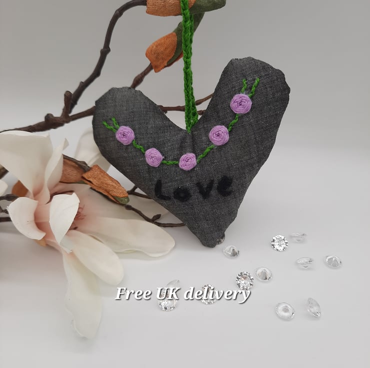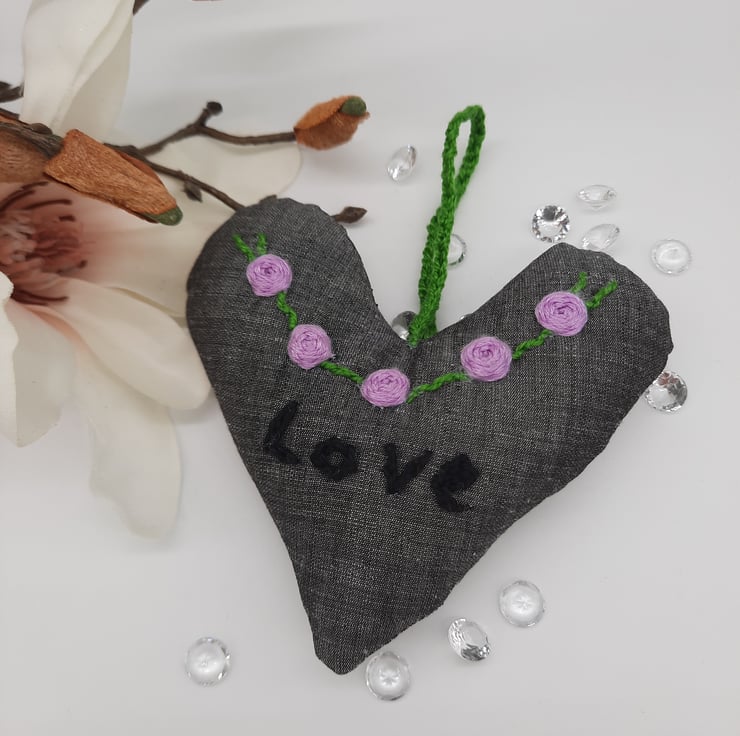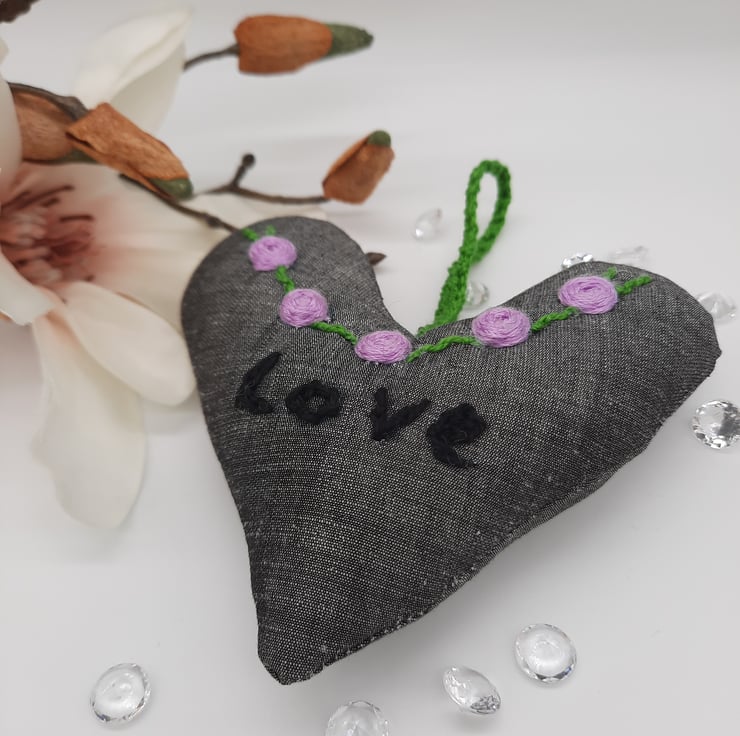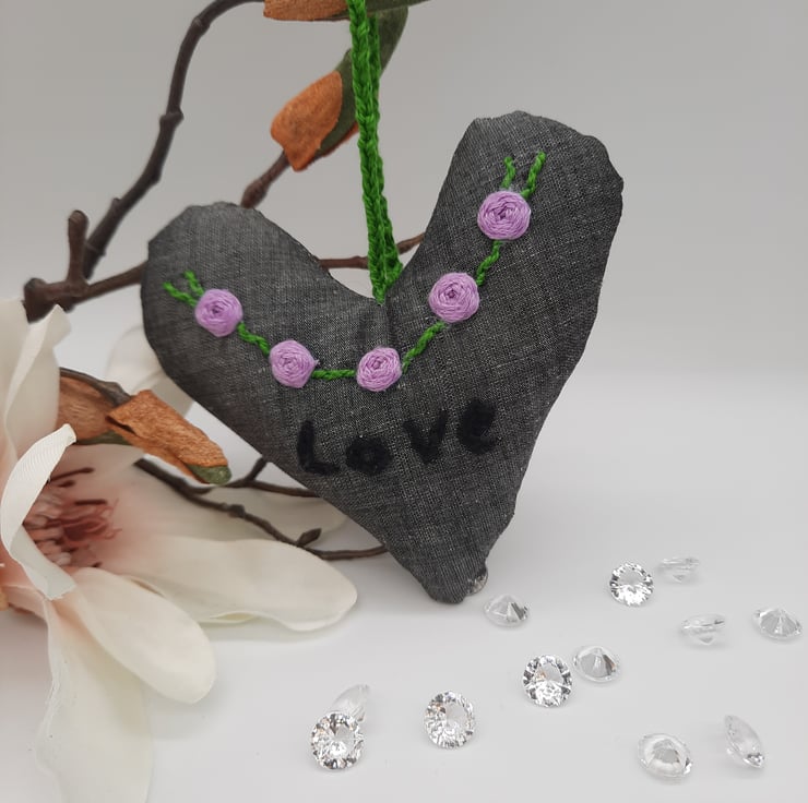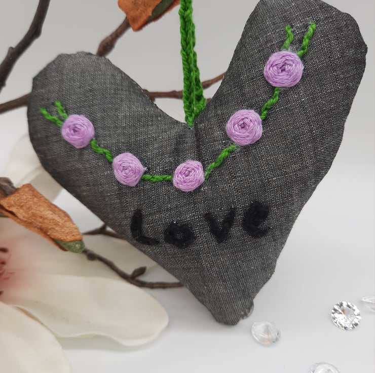The main fabric is grey. I've hand embroidered 5 purple rose buds across the top and the word "Love" at the bottom.