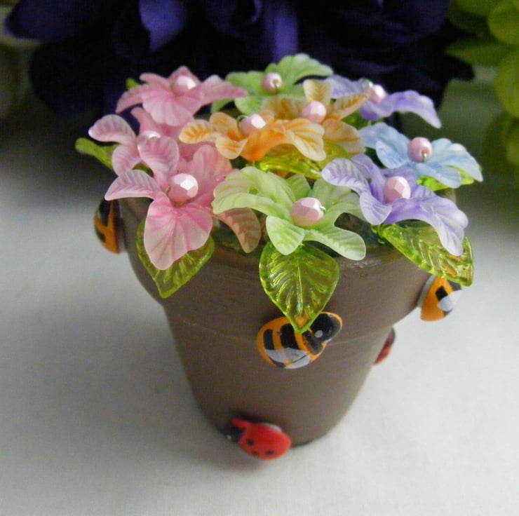 A beautiful small potful of tropical flowers handmade with, terracotta pot painted with brown acrylic paint and a brown piece of felt glued on the bottom, 25mm tropical Lucite flowers, 27x11mm translucent green Lucite leaves and 4mm powder pink firepolish beads are all threaded onto chartreuse wire and set into the pot with oasis and glue. Outside of pot is decorated with wooden ladybirds and bees.