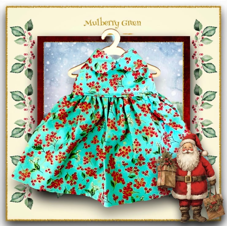 A lovely little turquoise dress in a berries print edged with gold, to fit the Mulberry Green characters. The dress is made from best quality cotton, has a full skirt and a lined bodice.