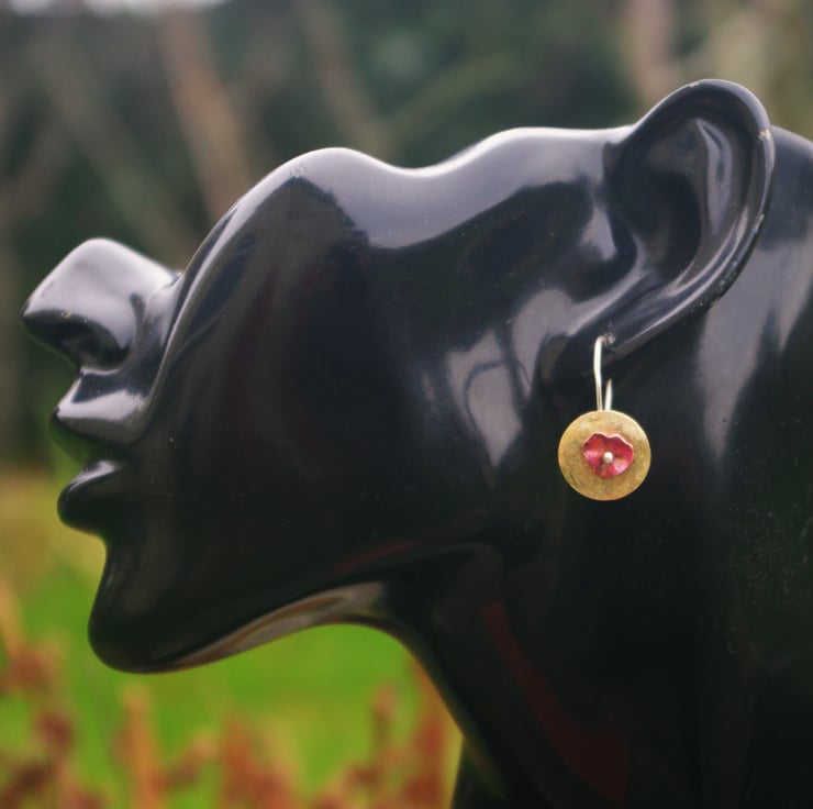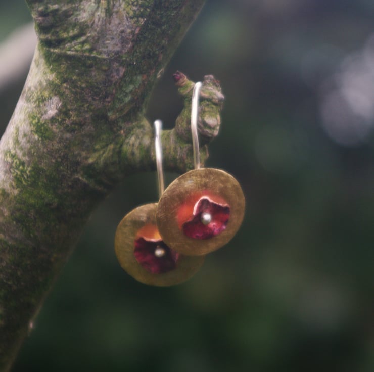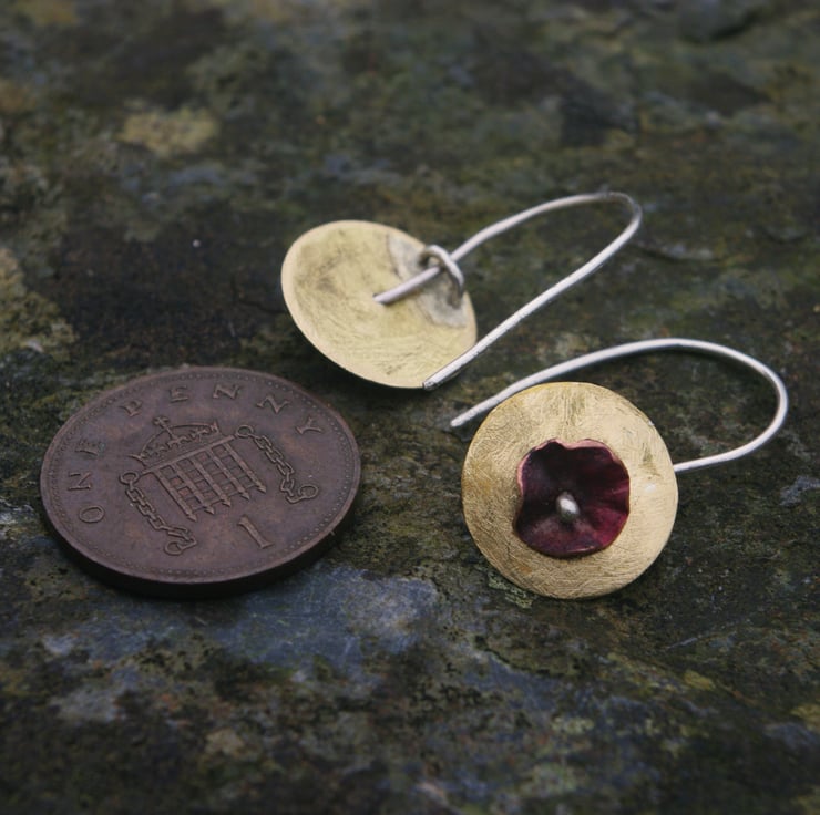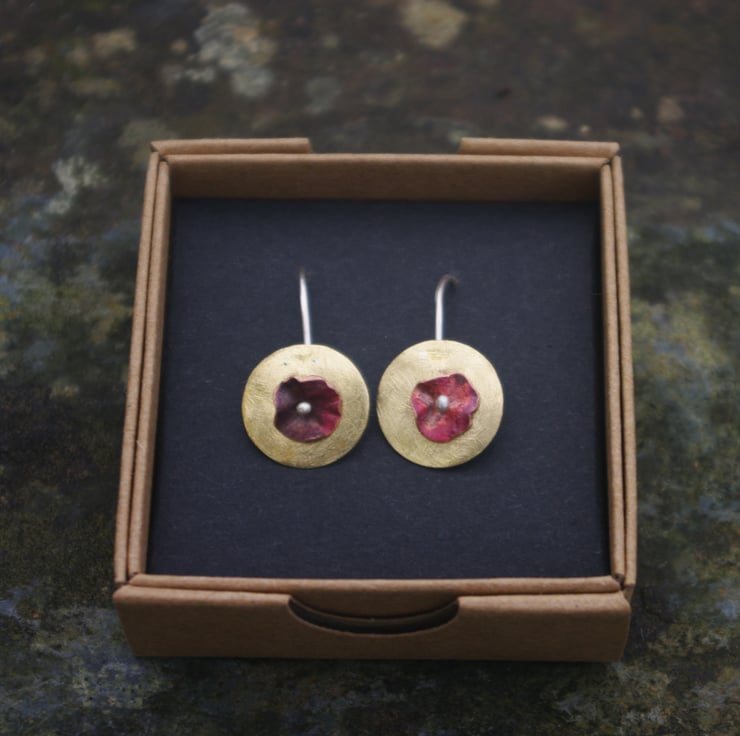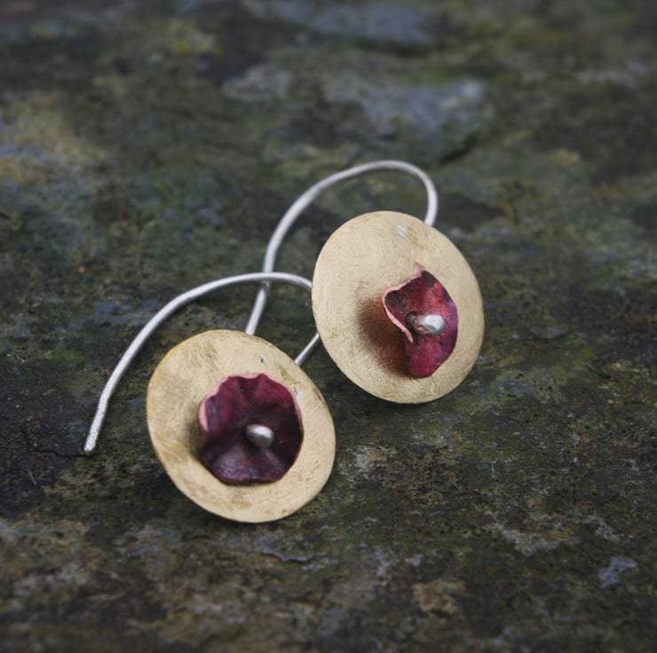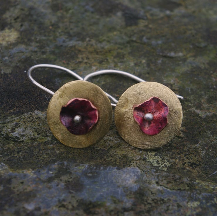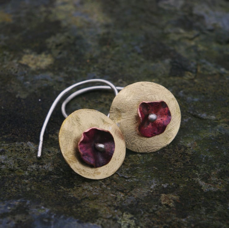 Brass circles with a copper flower in the middle making a simple but colourful pair of contemporary earrings, which would make an unusual Valentine's gift. The golden yellow of the brass , which has a frosted texture, contrasts well the copper. The red tones of the copper have been achieved with heat and the flower shape is secured to the front of the brass by a silver blob on the end of the ear hook .