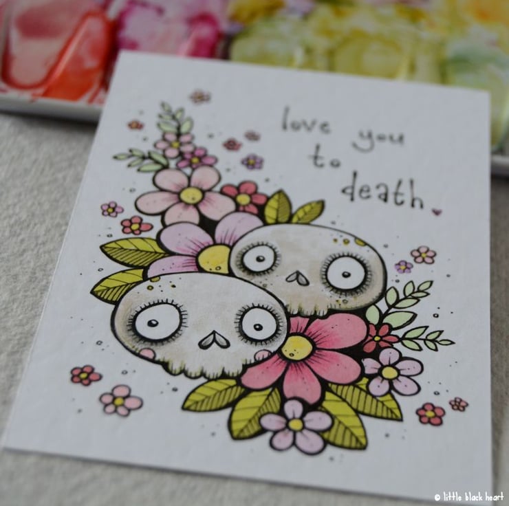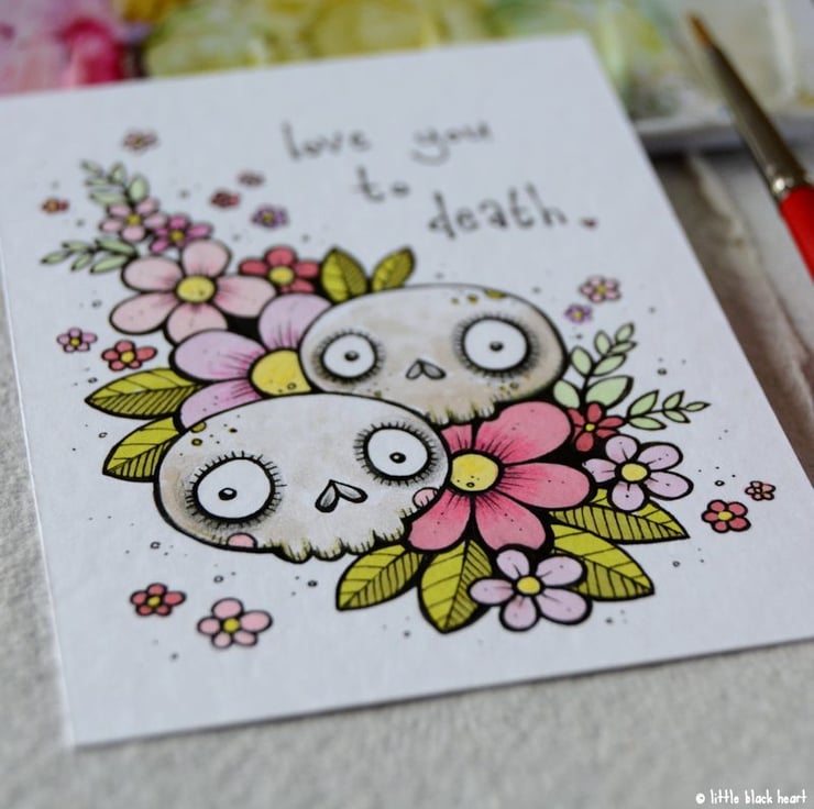 original artwork in artists pens, ink, pencils, and paints, on textured white 300gsm cardstock. drawn with a tiny 0.05 nibbed pen, carefully painted with just the very tip of a tiny paintbrush, and coloured with art pens and coloured pencils.