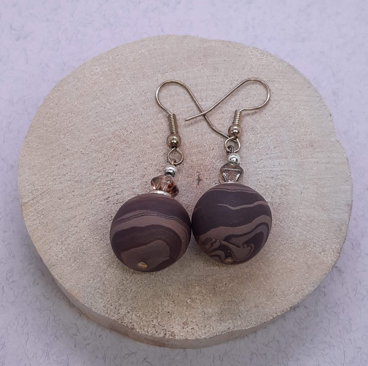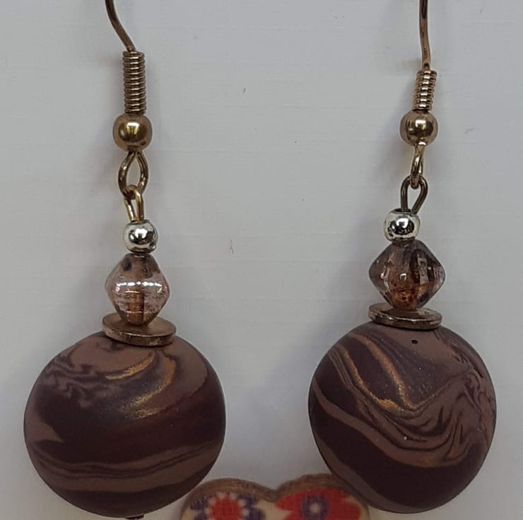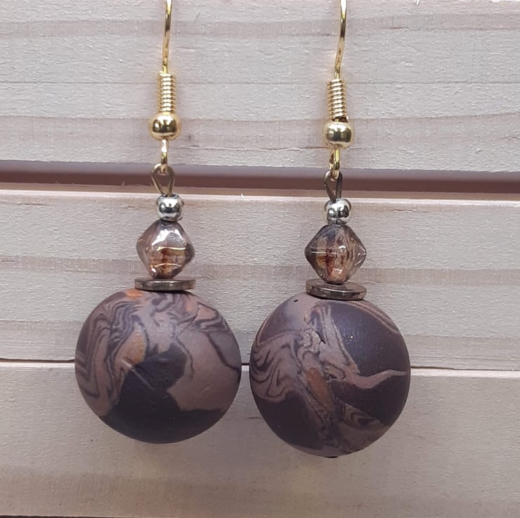Polymer clay dangly earrings in a chestnut brown, chocolate and gold unique swirl design