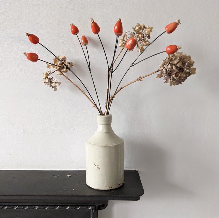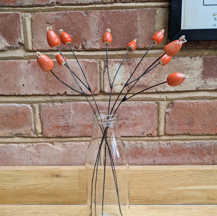 Ceramic rosehip stems, consisting of four rosehip berries on two wire stems, ideal for flower arranging. Sculpted by me in stoneware clay, fired, then glazed in Sunset Orange (a deep orange-red) and re-fired. The rosehips look lovely in fresh, dried or artificial flower arrangements - giving a beautiful pop of colour.