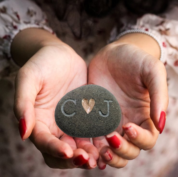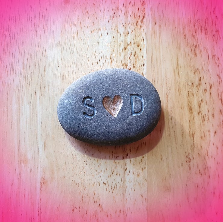 A smooth grey stone, deeply engraved with a heart symbol to give a contrast to the stone surface and with your choice of first initials either side of the heart. The deep heart shape is partially filled with a gold colour enamel and there is the option with this listing to have a special date or year engraved on the back. This thoughtful gift could be used as a paper weight, book end or an ornament for a desk, window cill or mantelpiece and given for a birthday, wedding anniversary, engagement gift, Christmas present, pet memorial or just to say 'I love you'...