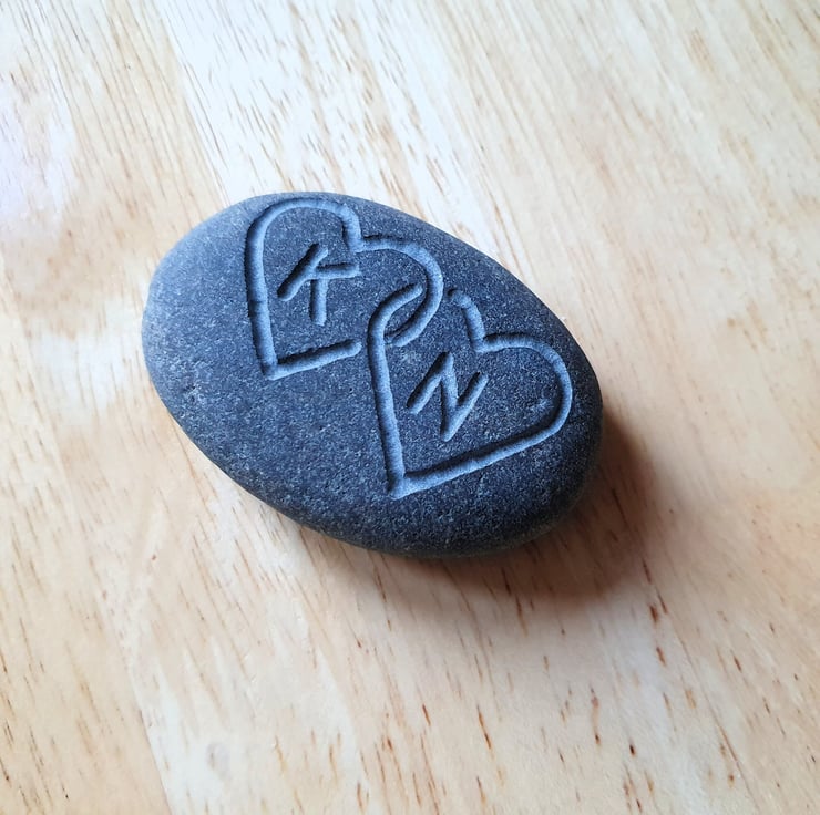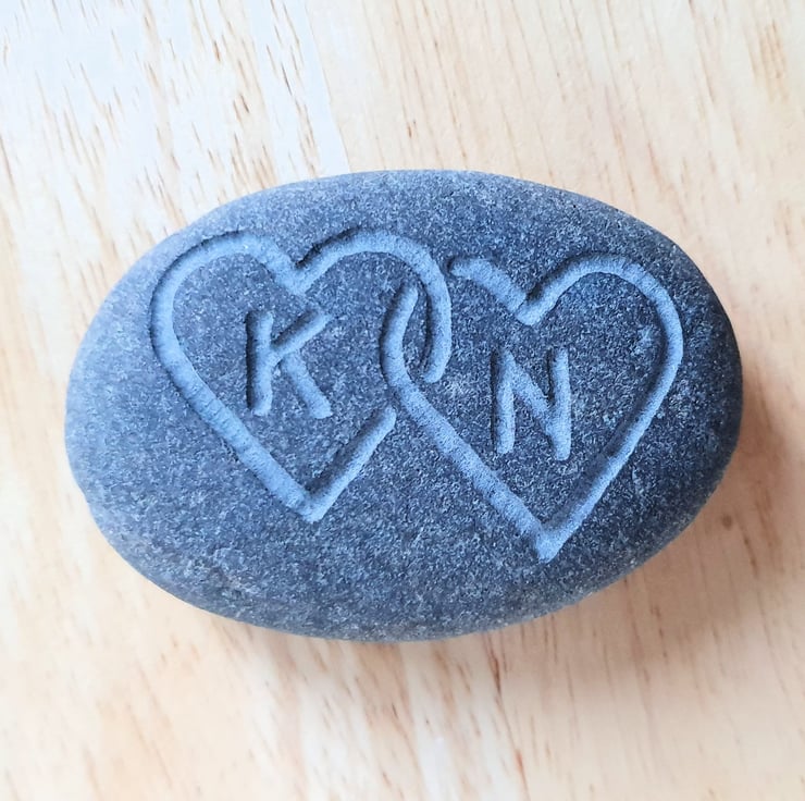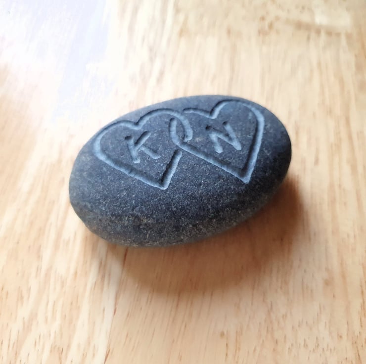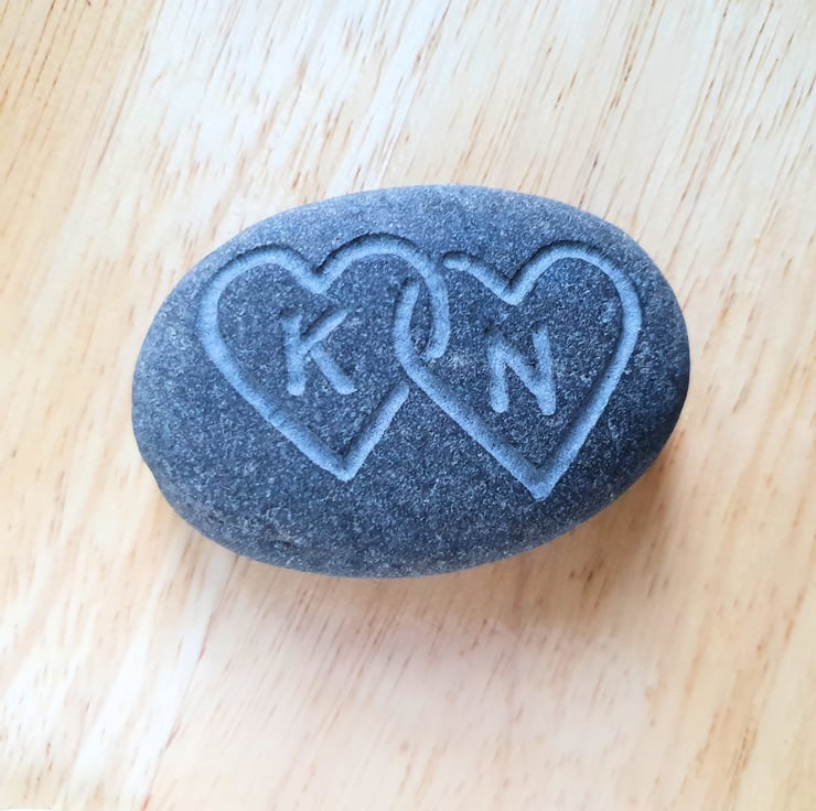 A smooth grey stone, deeply engraved with two intelocked hearts to give a tactile contrast to the stone surface and with your choice of first initials inside each heart. This thoughtful gift could be used as a paper weight, pocket hug or an ornament for a desk, window cill or mantelpiece and given for a birthday, wedding anniversary, engagement gift, wedding oath stone or just to say 'I love you'...