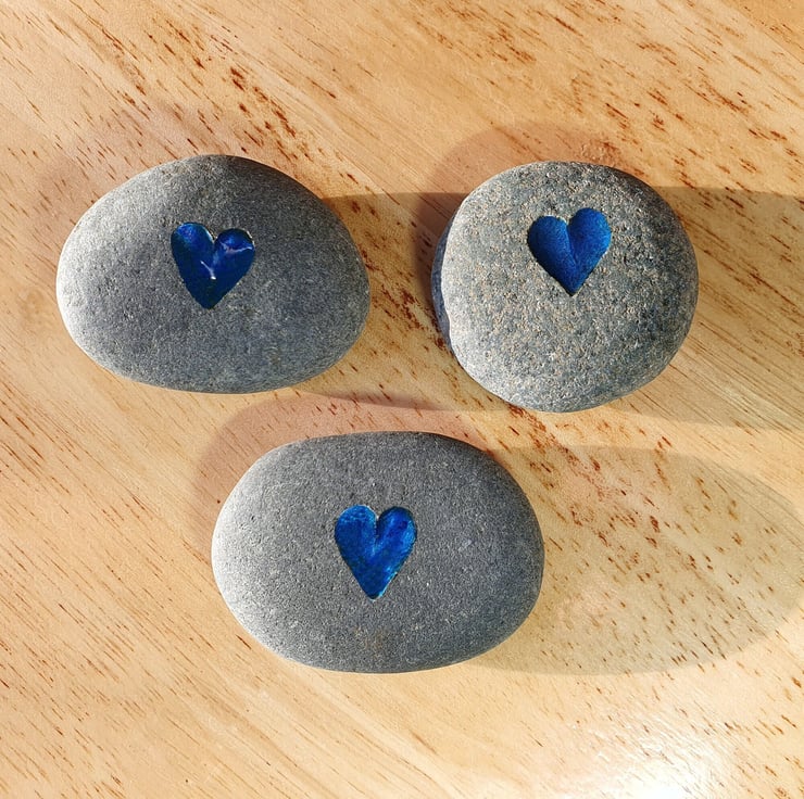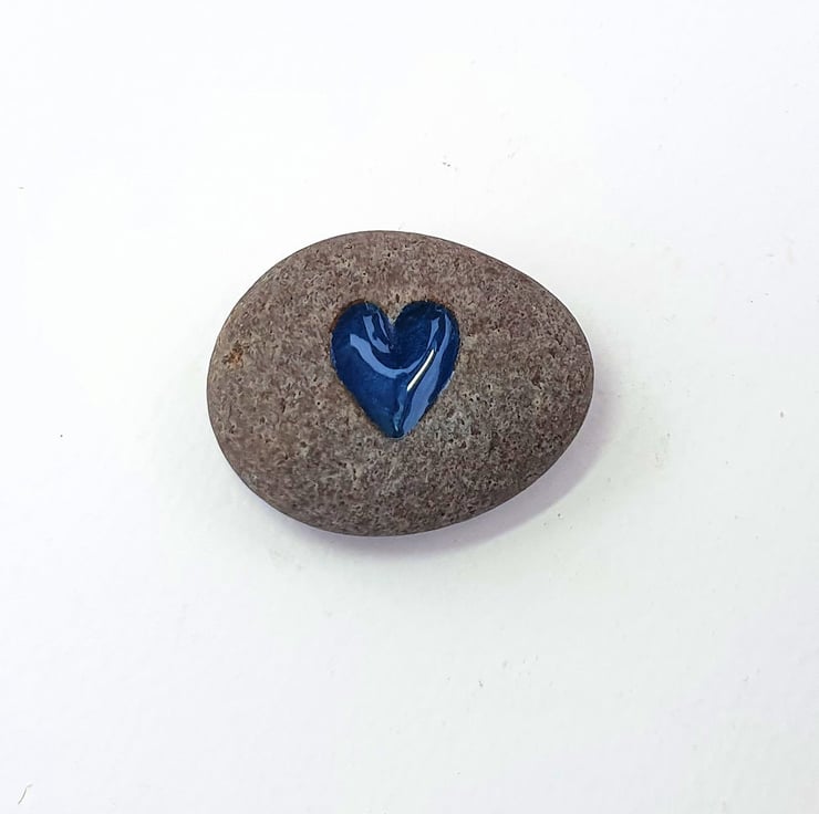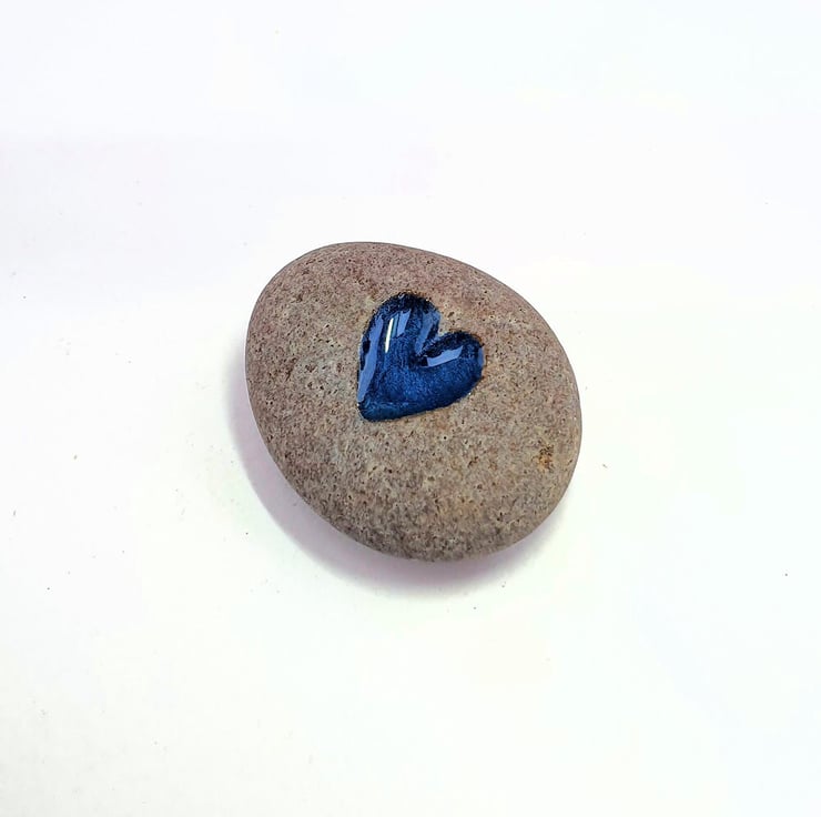 A brown, sandy biege or grey stone, deeply engraved with a heart symbol to give a contrast to the stone surface. The deep heart shape is then painted with a blue colour and then filled with a clear resin. This thoughtful gift could be used as a pocket hug, keepsake or an ornament for a desk, window cill or mantelpiece and given for a birthday, wedding anniversary, engagement gift, Christmas present or just to say thank you.