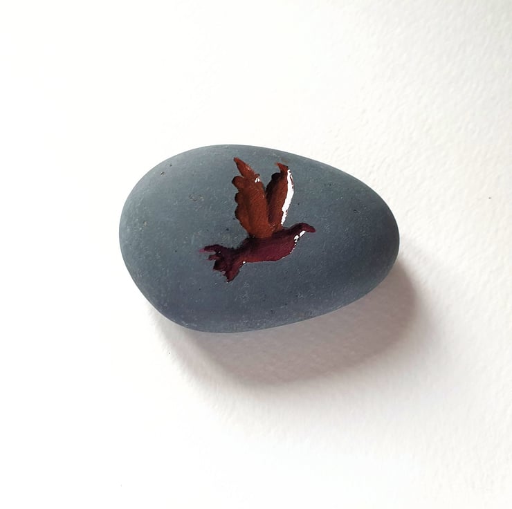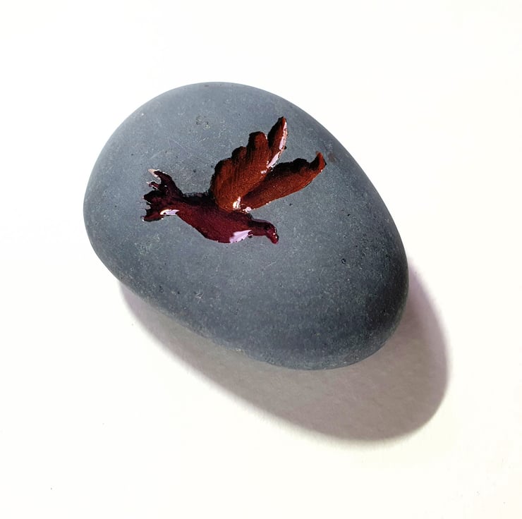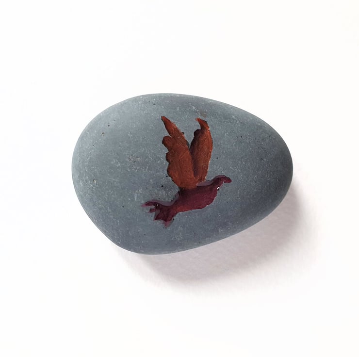 A smooth grey stone, deeply engraved with a Dove flying at sunset symbol to give a contrast to the stone surface. The Dove shape is then partially filled with a coloured enamel and resin glaze. This thoughtful gift could be used as a Valentine's Day gift paper weight, book end or an ornament for a desk, window cill or mantelpiece and also given for a birthday, wedding anniversary, engagement gift, Christmas present, memorial or just to say 'I love you' or 'thank you'...