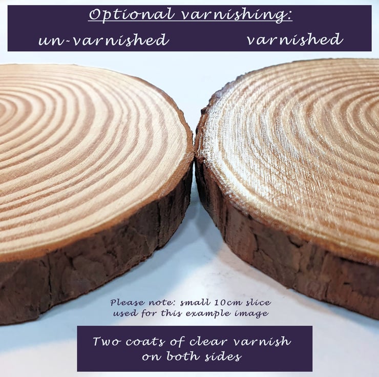If you would like this large wood slice varnishing both sides (with two cloats of clear varnish), then please select that option from the 'choose options' menu. Both sides of the large slice will be given two coats of varnish each, so please allow one extra day processing time to allow sufficient drying time for both coats on both sides. If you plan to place these large slices on a table either as stylish rustic place mat or centrepiece, then having them varnished will allow you to wipe them clean with a lower risk of any foodliquid staining them. Naturally, you are very welcome to varnish them yourselves, if preferable.