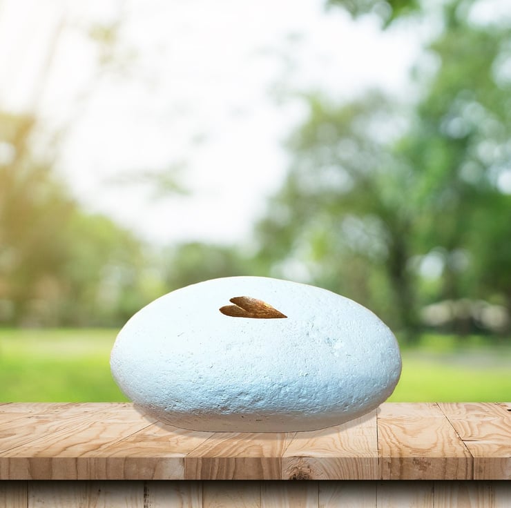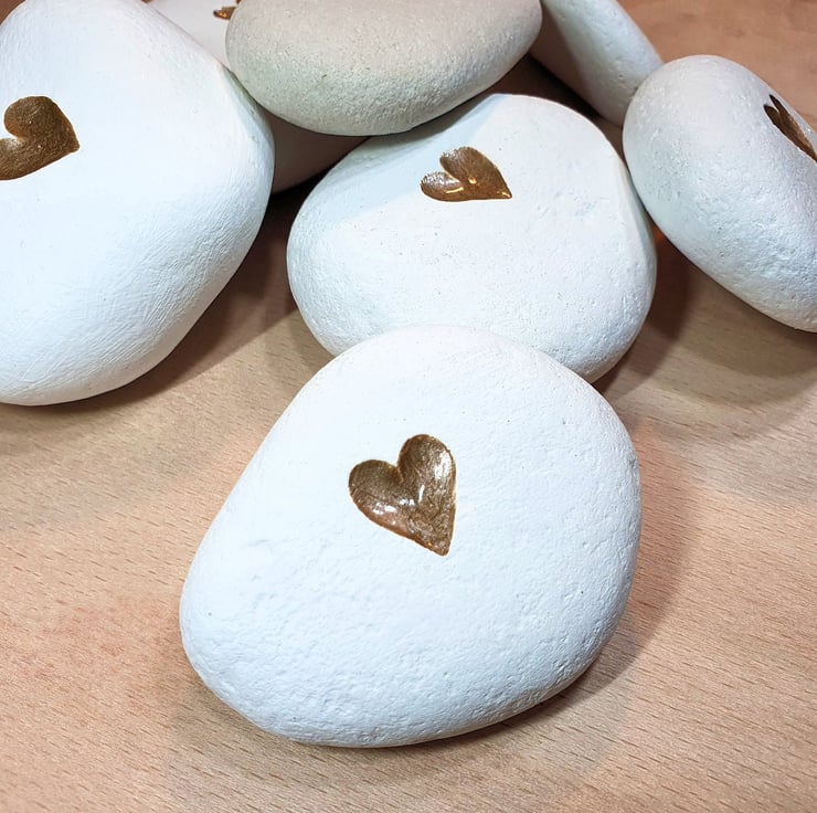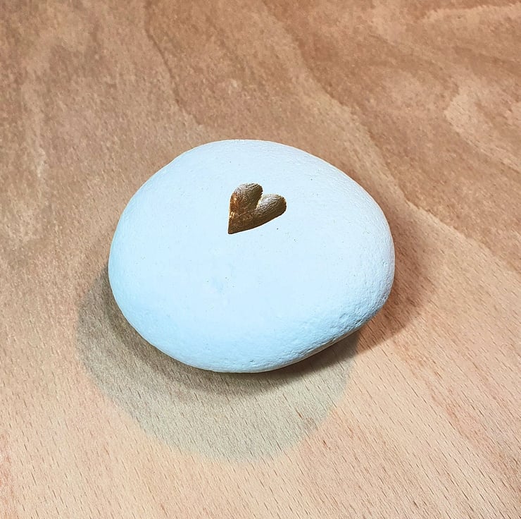 A medium/large white stone, deeply engraved with a heart symbol and then a gold coloured enamel inlaid to give a give a smooth contrast to the stone surface. This thoughtful gift could be used as a paper weight, book end or an ornament for a desk, window cill or mantelpiece and given for a birthday, wedding anniversary, engagement gift, Christmas present or just to say thank you.