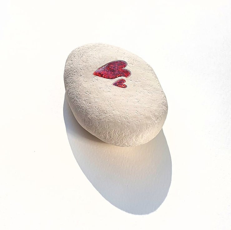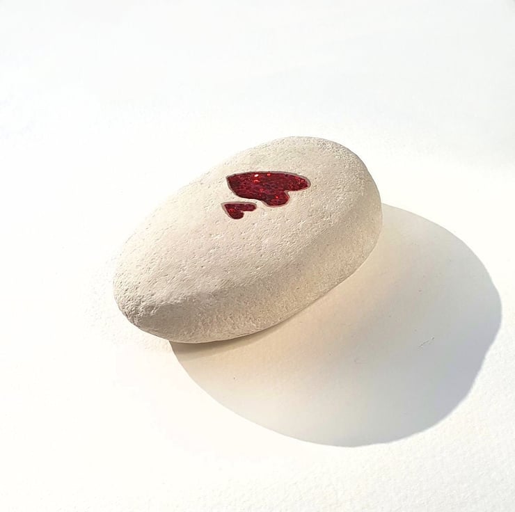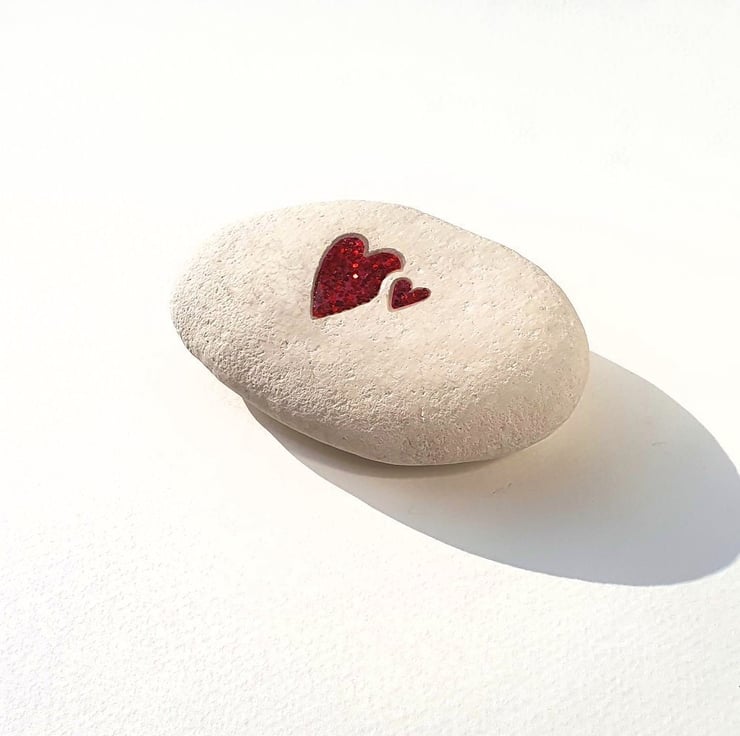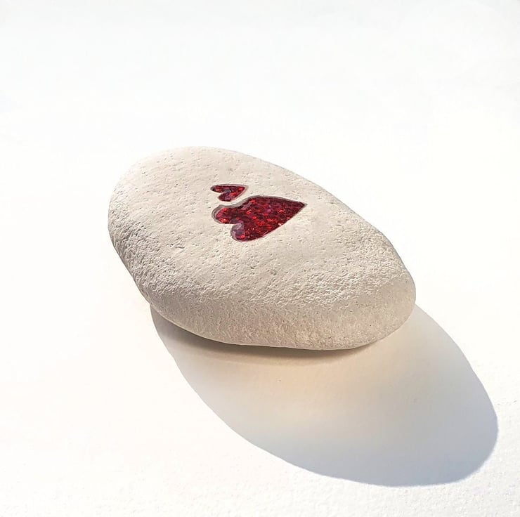 A white stone, deeply engraved with two heart symbols and then a red sparkle inlay to give a give a smooth contrast to the stone surface. This thoughtful gift could be used as a paper weight, book end or an ornament for a desk, window cill or mantelpiece and given for a birthday, wedding anniversary, engagement gift, Christmas present, Mother's day or just to say thank you.