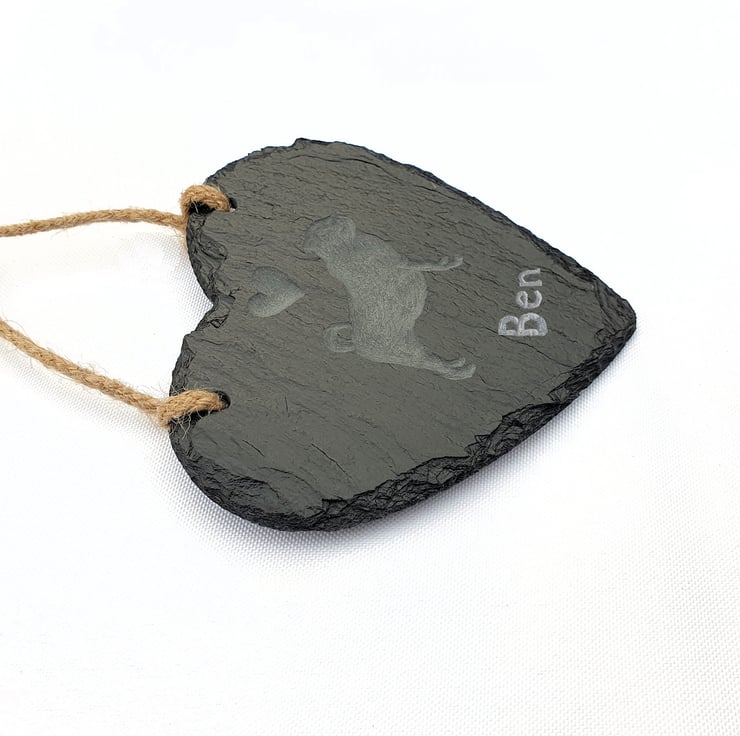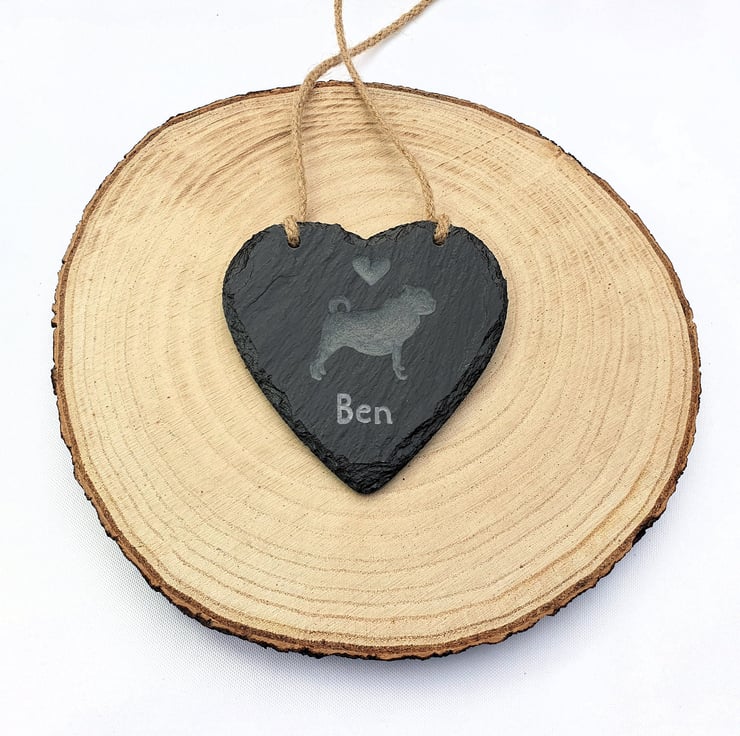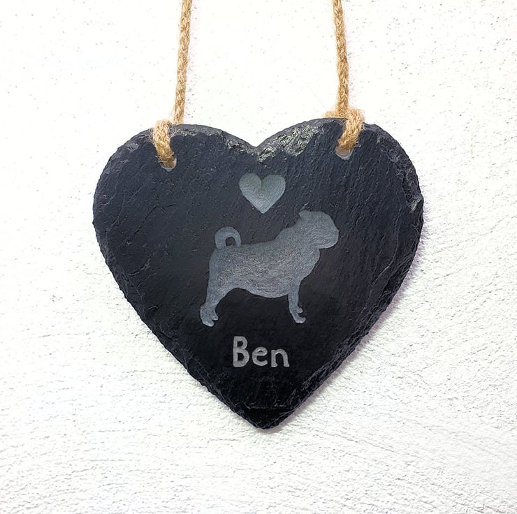 A thoughtful gift for anyone that has lost a much loved Pug and would like to mark their passing with this hand carved slate garden stone ornament. Each heart shaped piece of slate is hand carved deeply in to the surface with the shape of a Pug, then a heart above it.