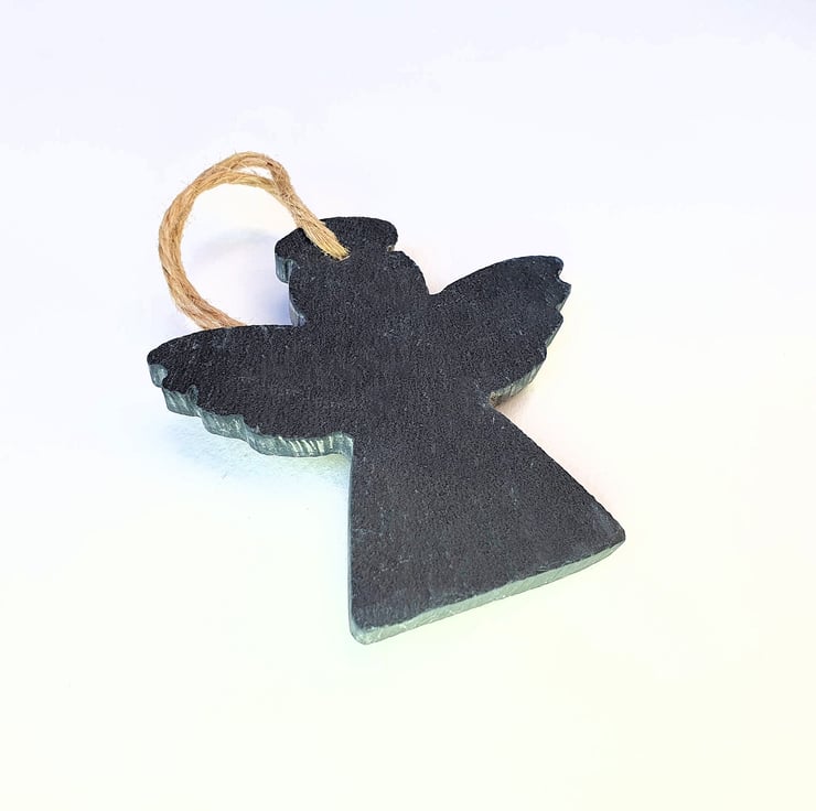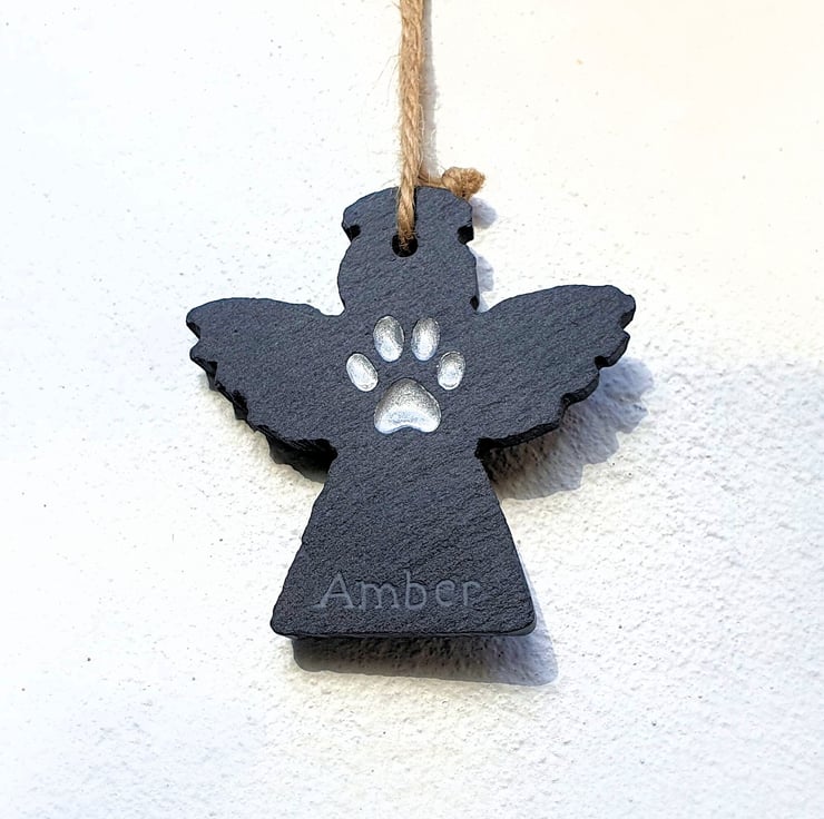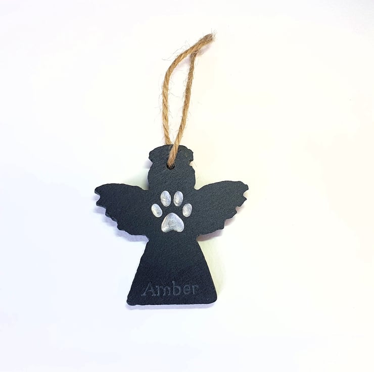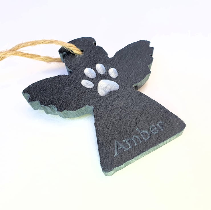 The slate is carved to form the shape of an angel and then hand carved pets paw on the surface, along with the name of your choice. The shape is partially filled with a silver enamel to give a smooth but shiny finish. The angel slate has a piece of Jute twine attached and included.