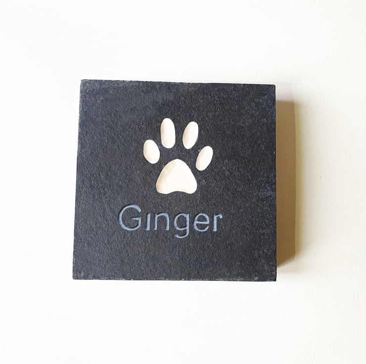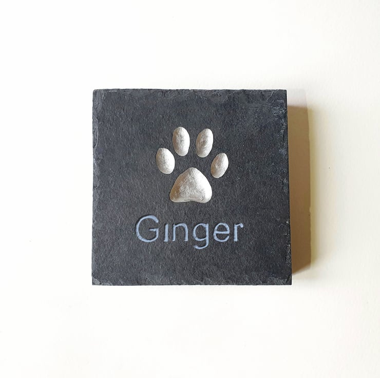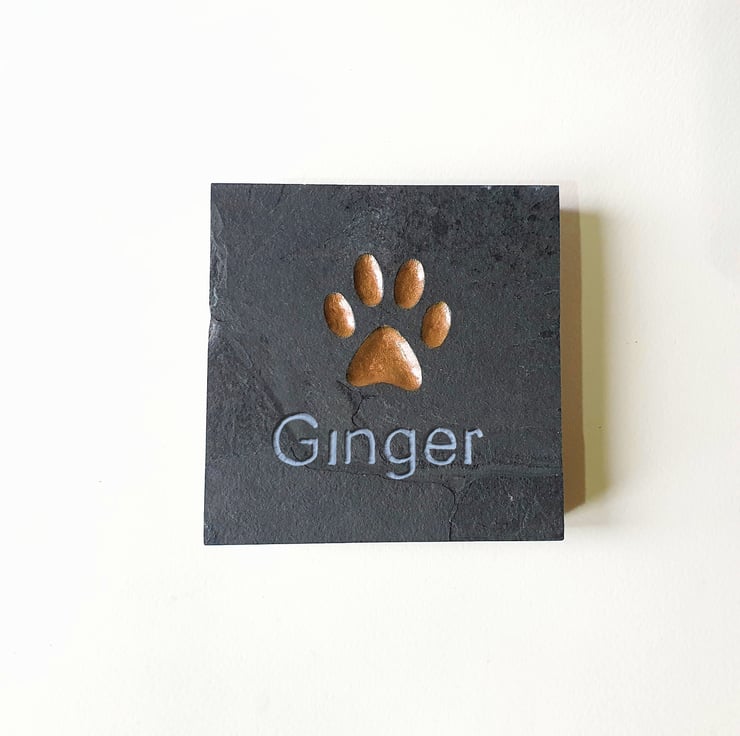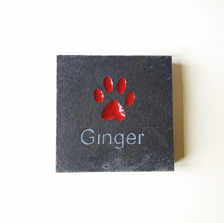 The slate is hand carved to form the shape of a pets paw on the surface and then engraved with their name. The pets paw shape will be gold enamel as standard but if you would prefer red, silver, white or natural (no paint), then selection from the 'choose options' menu. Gold enamel is the default choice for the paw, if you don't make a selection from the options.