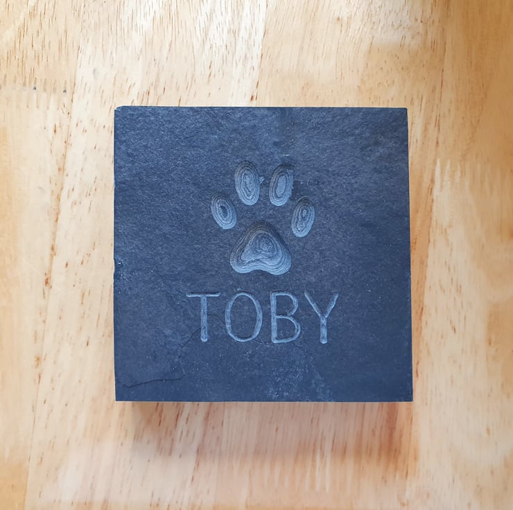 A thoughtful gift for someone who is bereaved at the loss of their much loved pet and would like a memorial stone. You can let me know the pets name and I will hand carve it onto a slate block, just underneath a hand carved pets paw shape. The slate blocks are around 20 to 23mm thick and substantial enough to be free-standing. The natural slate can be set down in a garden or used as an ornament, paper weight or for general display on a bookcase, desk, mantelpiece or window cill etc.