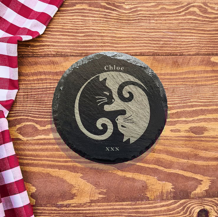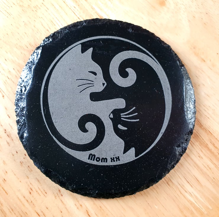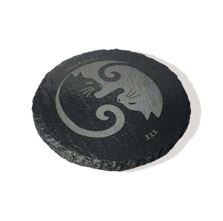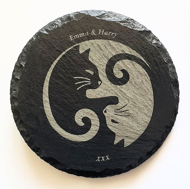 A pur'fect gift for anyone that likes cats, owns cats, would like a cat or who has lost a cat and is missing them. Two cats curled up and cosy, engraved in a ying yang design on to a natural slate coaster.