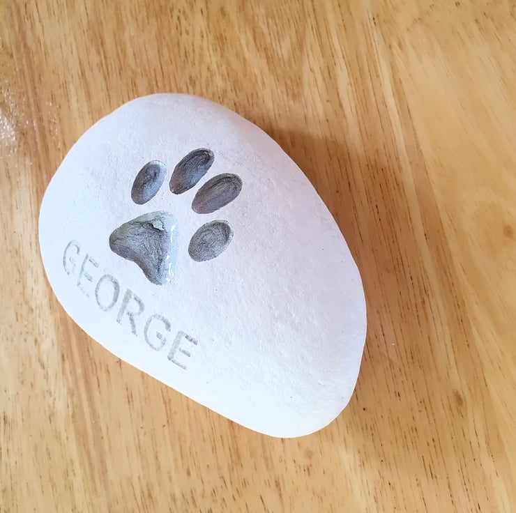 A medium sized white stone, deeply engraved with a pets paw and then a silver coloured enamel inlaid to give a give a smooth contrast to the stone surface. You can also have your pets name engraved on the front of this stone and we'd recommend it being just underneath the paw print. This thoughtful gift could be used as a paper weight, book end or an ornament for a desk, window cill or mantelpiece and given for a birthday, wedding anniversary, engagement gift, Christmas present, Mother's day or placed in a garden to remind you.