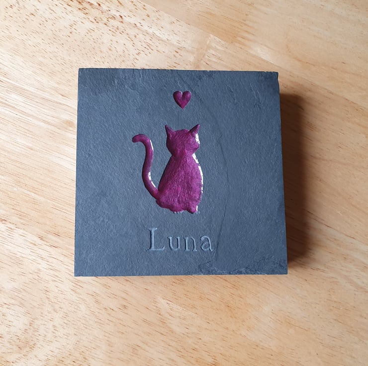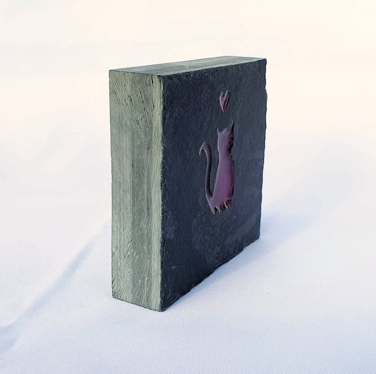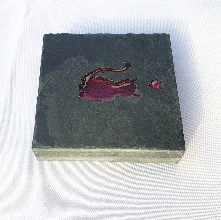 The slate is hand carved to form a cute cat shape and a heart in the surface, then painted with a purple enamel paint and then partially filled with clear resin. The striking effect of shiny purple on slate is classy and tactile to touch.