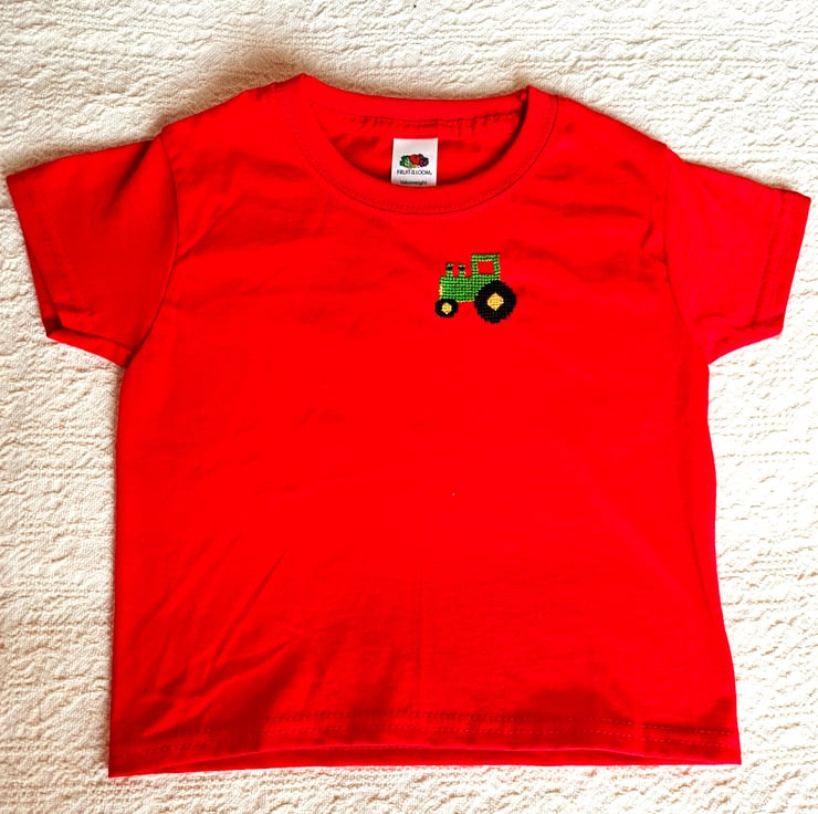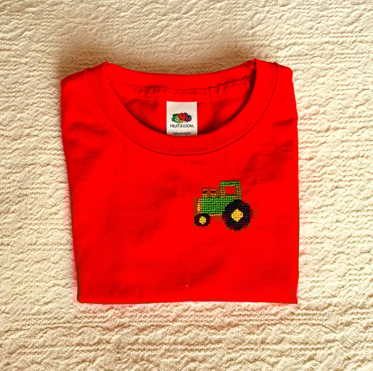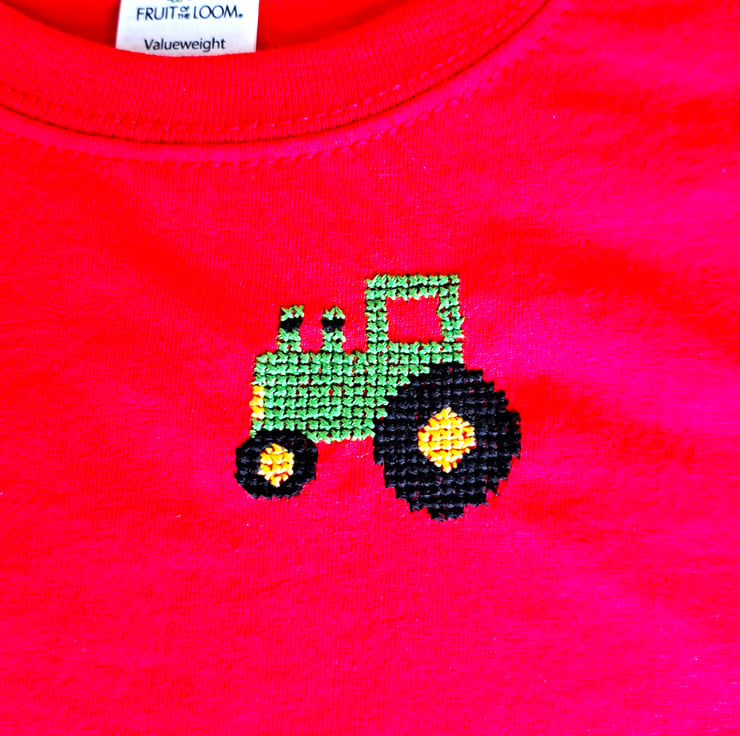 Kids love tractors. I have hand stitched a green tractor of my own design on the left front of this lovely scarlet T-shirt by Fruit of the Loom. I never use a permanent backing material when embroidering kids' clothing, so there is nothing inside to irritate your child's skin. The shirt has short sleeves, is all cotton and can be machine washed.