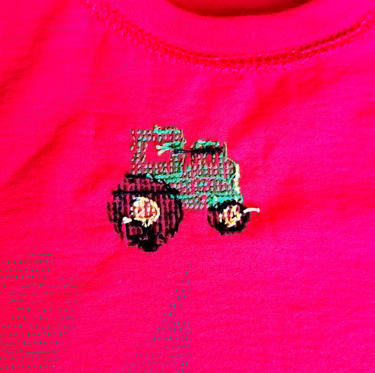 Kids love tractors. My tractor motif has been very popular for many years. I first designed it for the four year old son of a friend, who asked me to stitch his Daddy's tractor. He was bitterly disappointed when I embroidered a red one, as Daddy's tractor was a John Deere! I owe that child (now grown up and a farmer). His tractor shirt was the first of many.