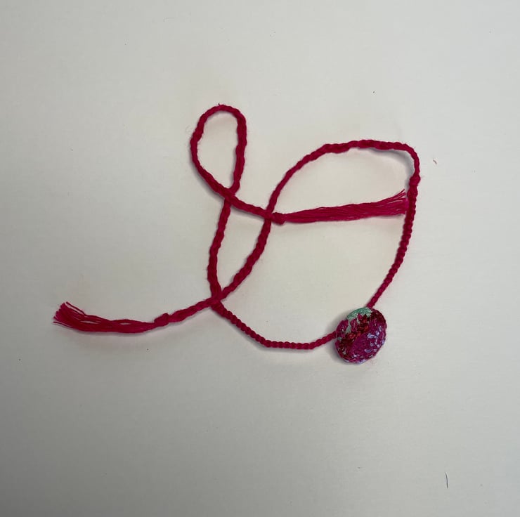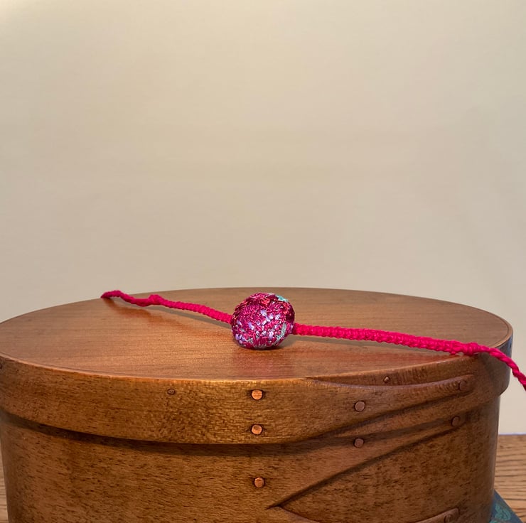 The button is hand covered in a hand embroidered silk fabric piece and the band has been hand woven, from a cotton yarn, using a plaiting and macrame technique.