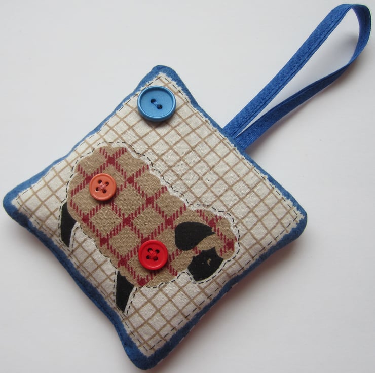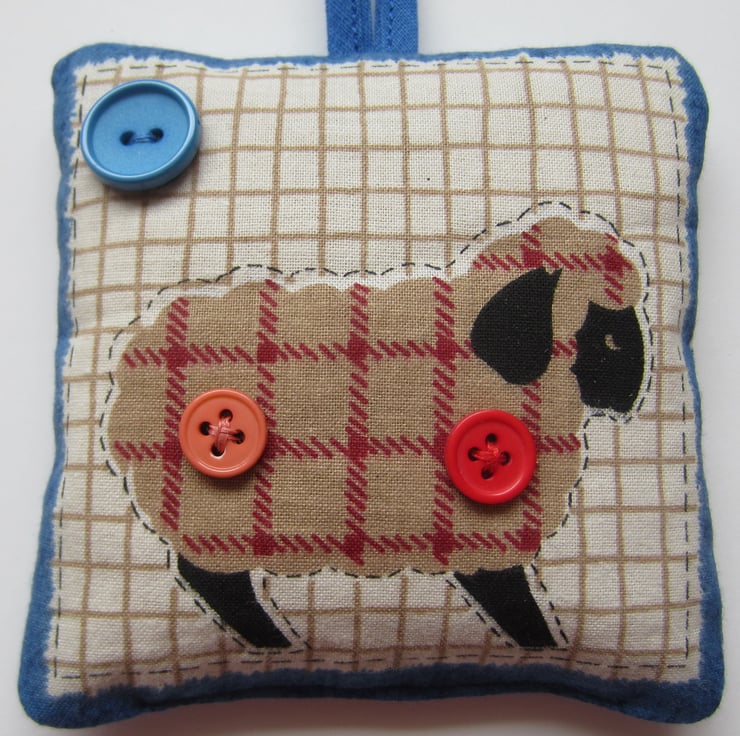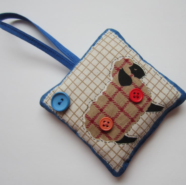 Hanging lavender sachet made from a sheep fabric and decorated with 3 buttons. It is backed with blue and white check gingham fabric.