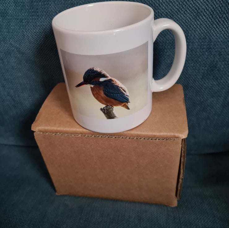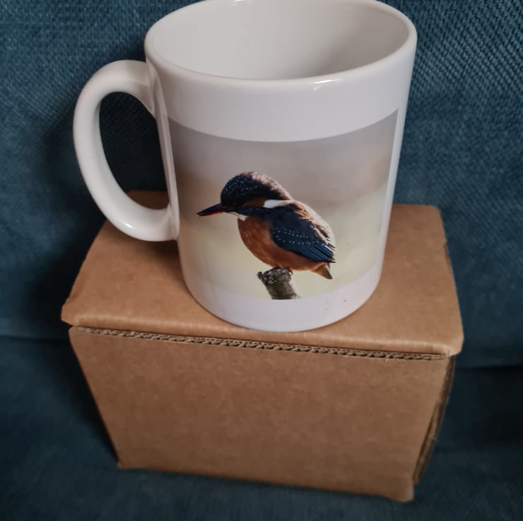 10oz white mug featuring an original photo of a Kingfisher which I fortunate to spot and photograph whilst I was bird watching in Titchfield Haven Nature Reserve in Hampshire on 25th November 2023. The photo of the Kingfisher is on both the front and back of the mug.