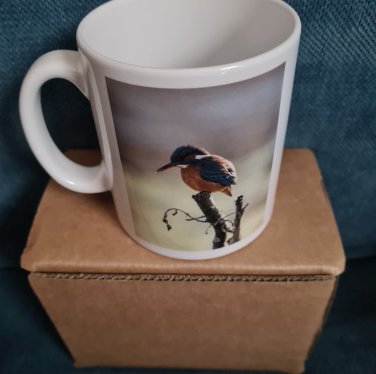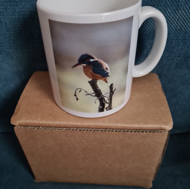 The photo of the Kingfisher is on both the front and back of the mug. The height of the mug is 9cm and the diameter is 8cm