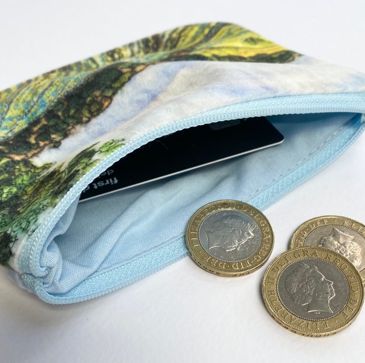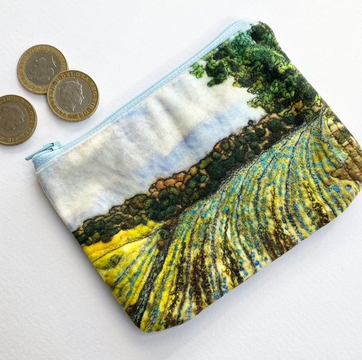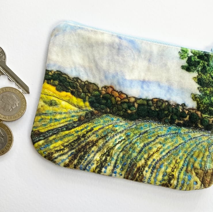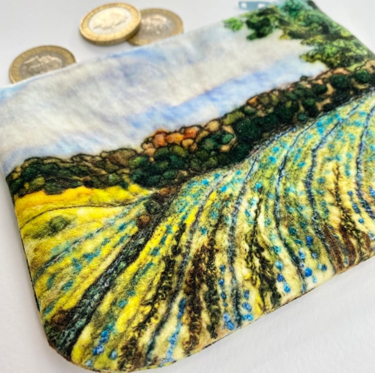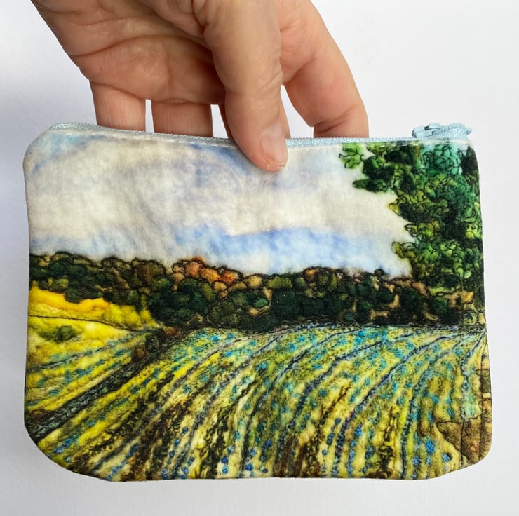 This highly versatile gorgeous zip bag is decorated with a print of one of my felted landscapes on. This one shows a beautiful flax field in summer. It’s lined with a cotton lining and has various matching coloured zips. The print is on the front and back.