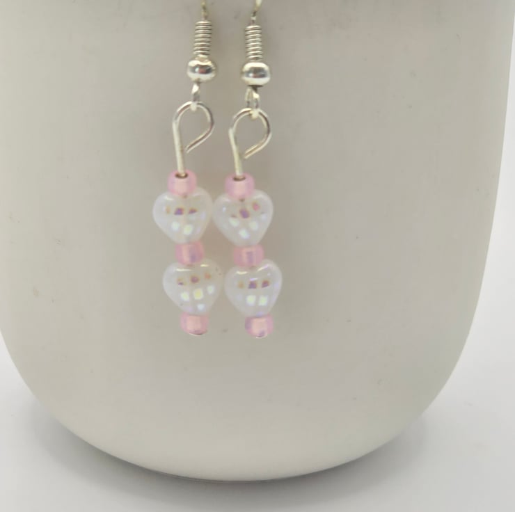 The earrings are made using 2 white peacock glass heart beads. In between the heart beads are light pink seed beads. The beads are on silver plated pins. The hooks can be replaced with clip-ons, please select the correct option from the drop down menu.