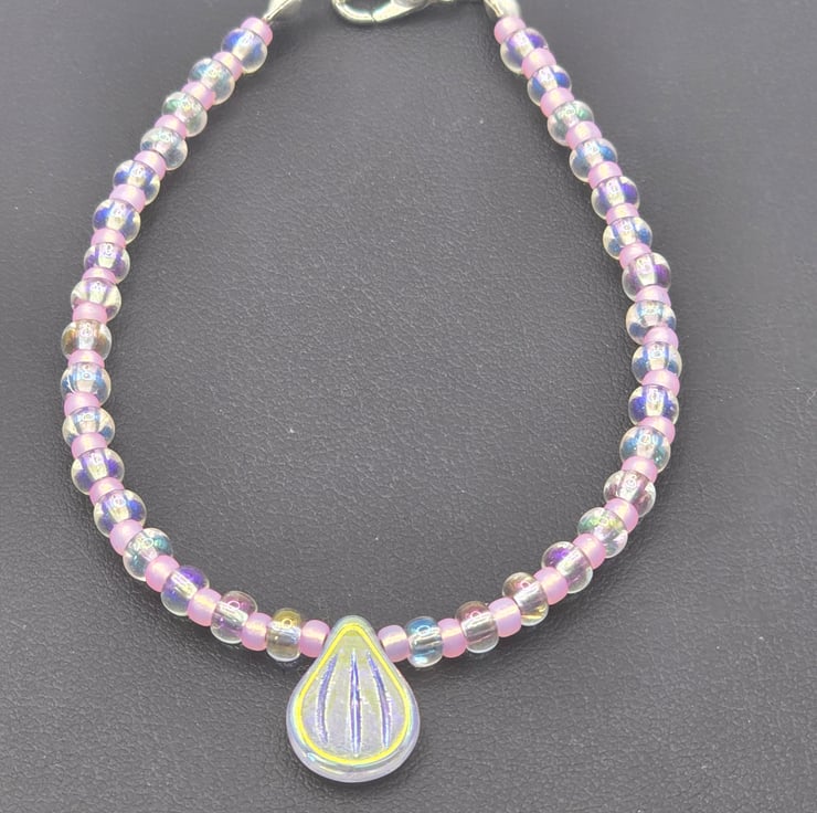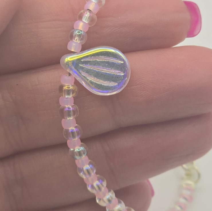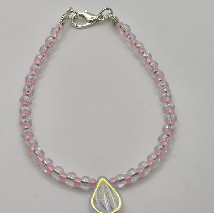 The bracelet has been made using large clear crystal AB seed beads with small pale pink seed in between with an engraved clear crystal pip bead in the center of the bracelet. The beads are on a thin beading wirre and the bracelet fastens with a silver clasp at the back.