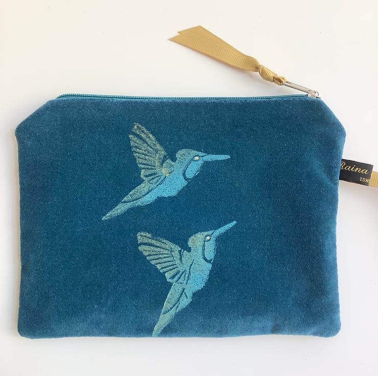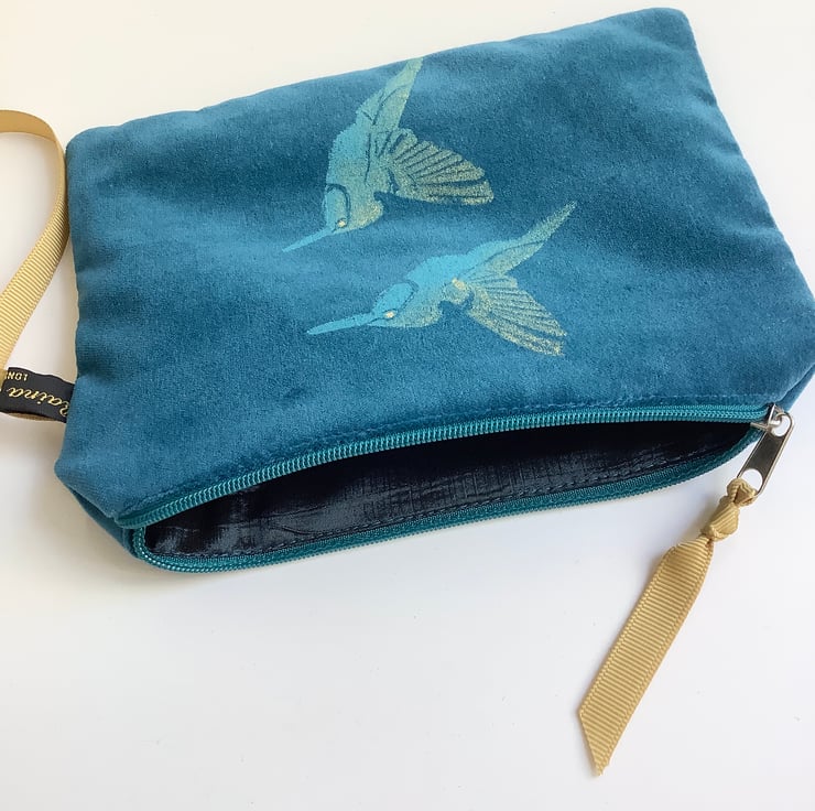 Teal Hummingbirds velvet zip-up pouch