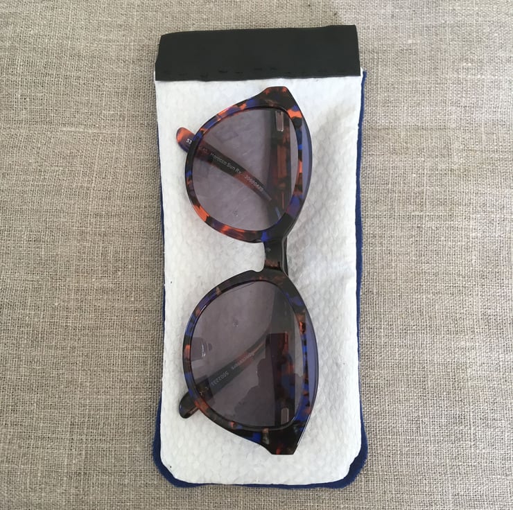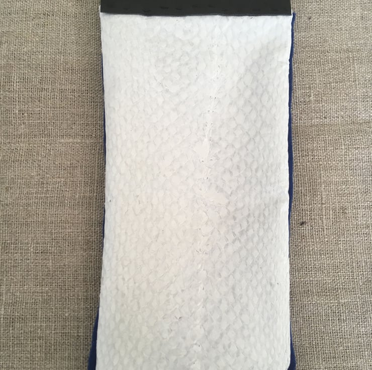 This is an 8 cm x 18 cm white Salmon leather and Blue Reindeer leather sunglasses case that has been made from upcycled reindeer leather scraps and zero waste salmon skin. The eyeglasses pouch has been hand stitched using waxed linen thread. The Eye glasses case has a flex frame enclosure.