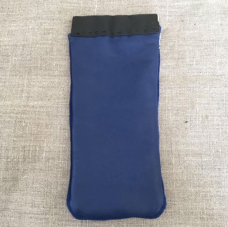 One side of the eyeglasses pouch is made of blue reindeer leather. The other side is white Salmon leather. The edges of the bag are stitched with a thin strip of wool trim.