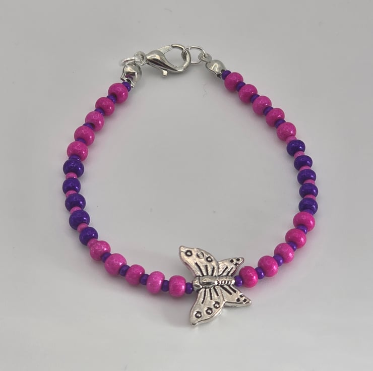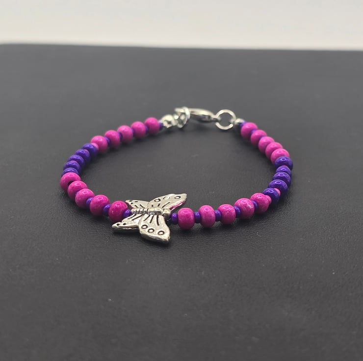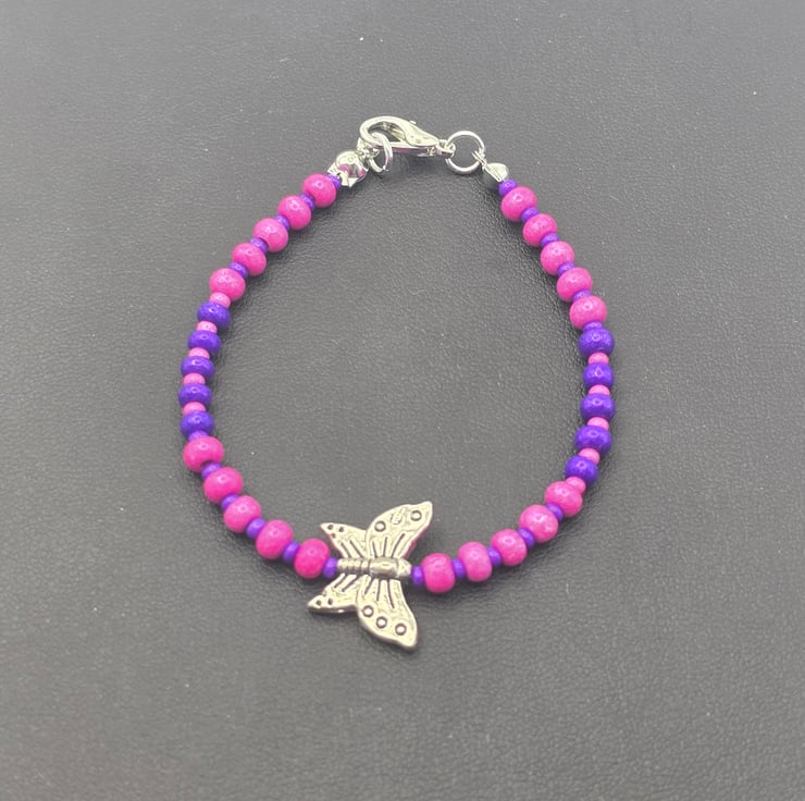 The bracelet has been made using a lovely mix of large pink and purple seed beads with small purple and pink seed beads. The colours alternate all the way around with a silver metal butterfly charm in the centre of the bracelet. The beads are on a beading wire and it fastens with a clasp at the back.