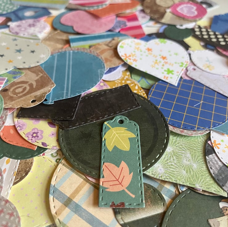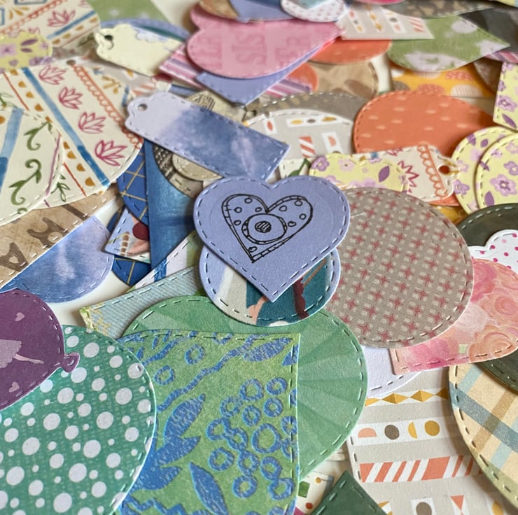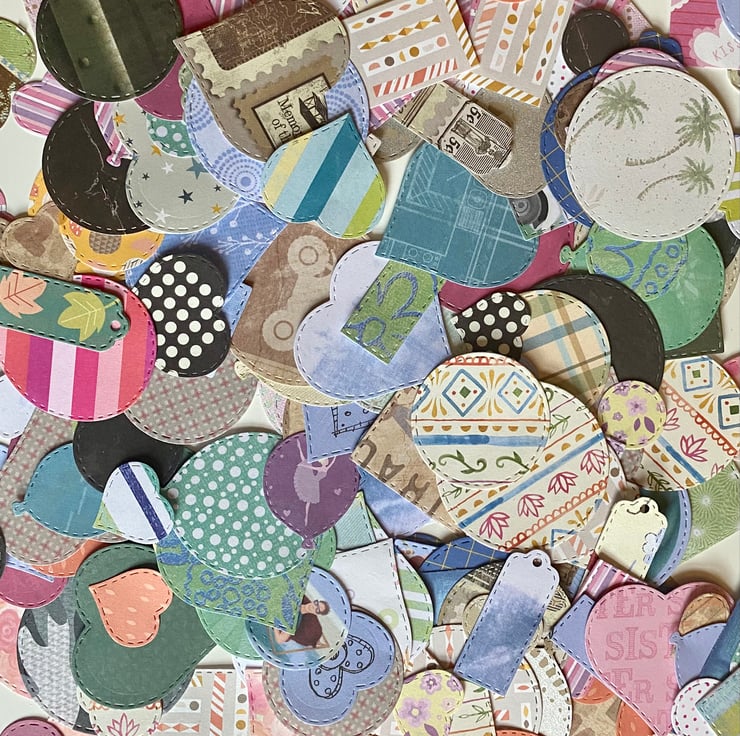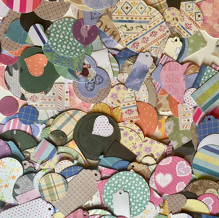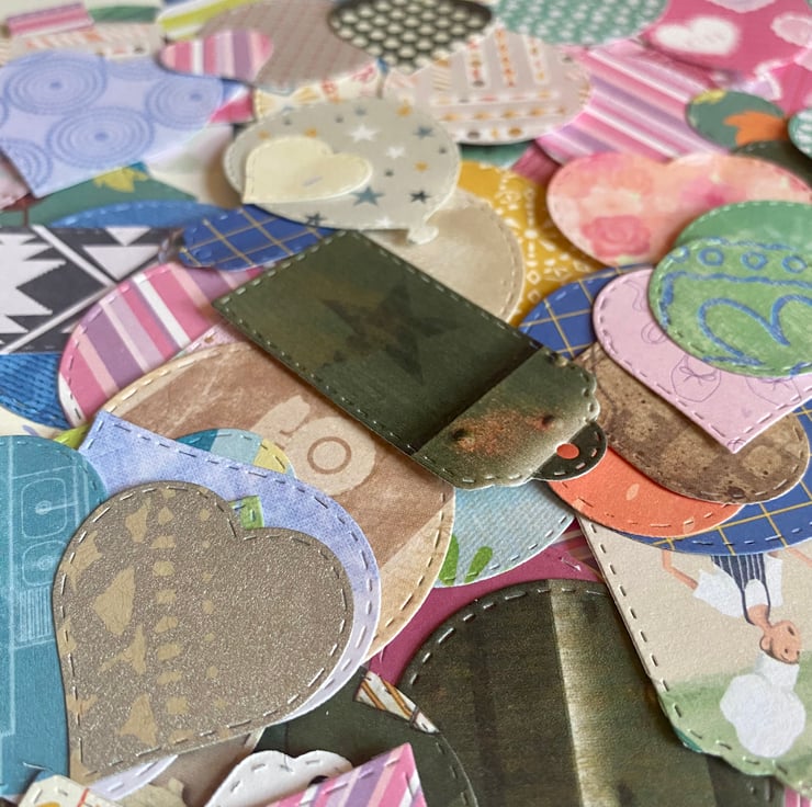 Pack of 50 random shapes hand die cut from different patterned paper/thin card (some double sided, some not). The shapes include hearts, tags, balloons, circles and a small number of rectangles.