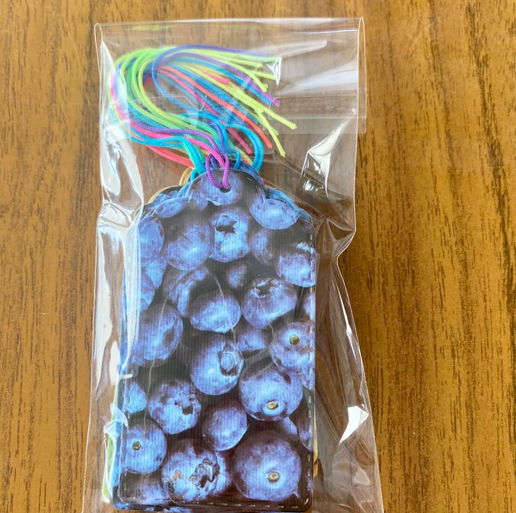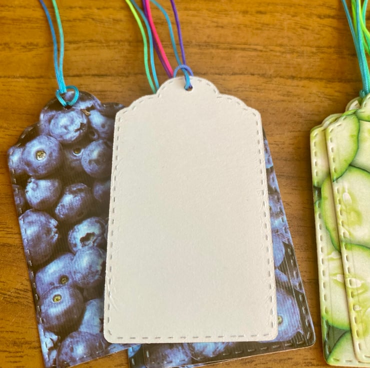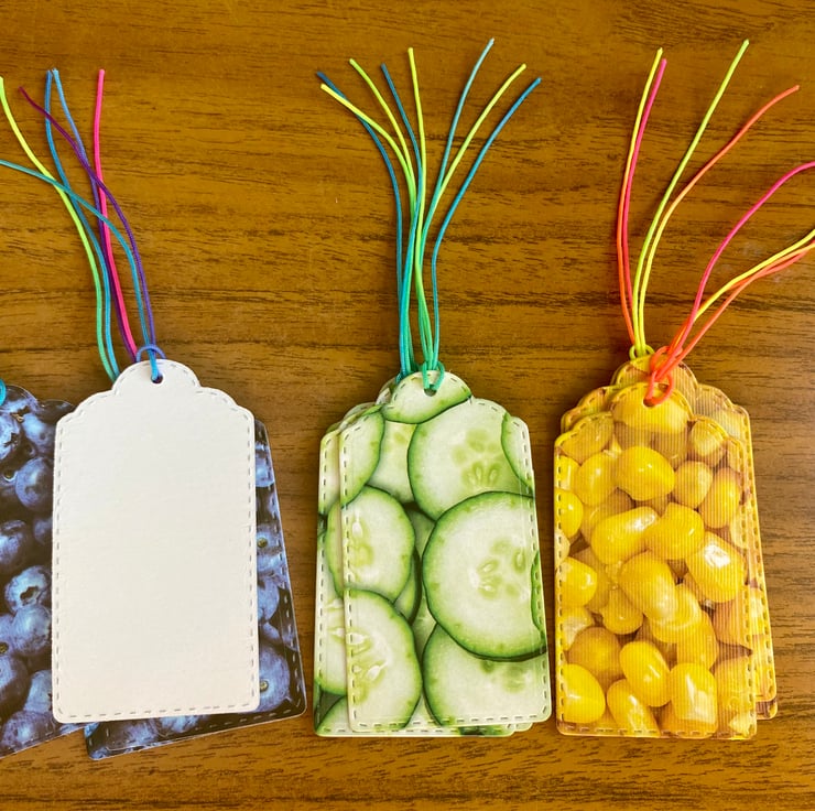 This is a pack of 12 tags, with 4 of each design there are 4 x sweetcorn, 4 x cucumber and 4 x blueberries.