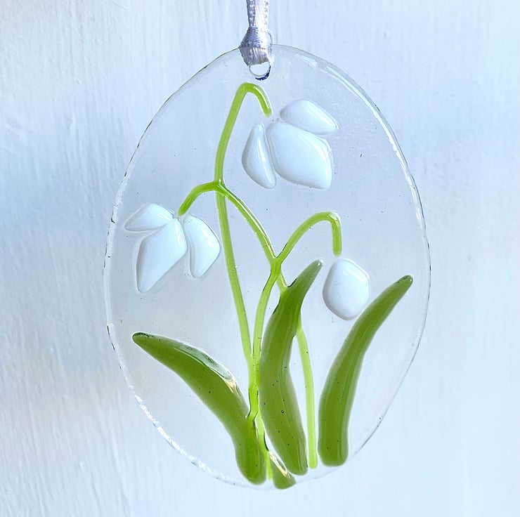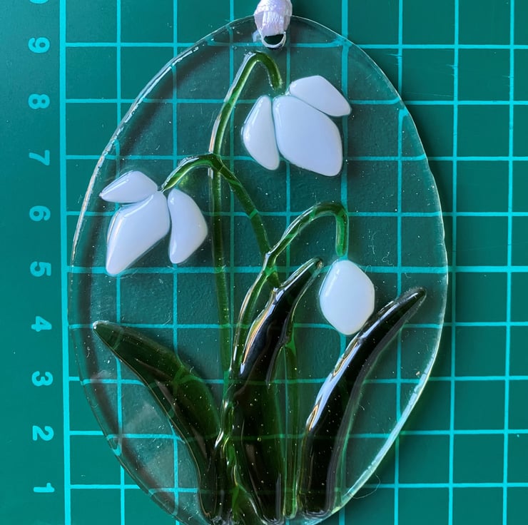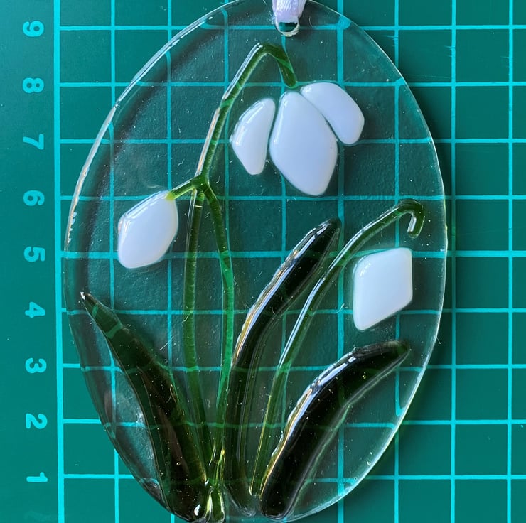 Bringing some colour to winter, these oval shaped snow drop decorations were made with hand cut art glass placed onto a clear base. They were placed in a specialists glass kiln and fired slowly to 730 degrees Celsius to fix the pieces to the base, whilst allowing them to retain their shape and height (rather than melting down to one solid piece of glass). They have been drilled with a hole and hung on white satin ribbon to hang in either a window or a place of your choice.