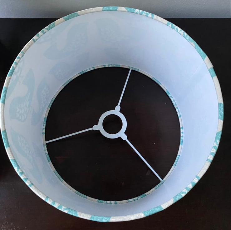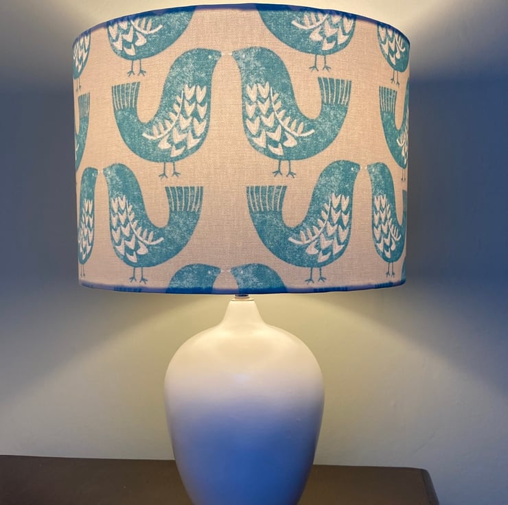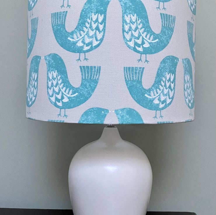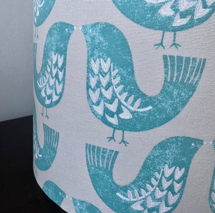 This cute lampshade has been handmade using the stylish retro Scandinavian Birds fabric by Clarke and Clarke.