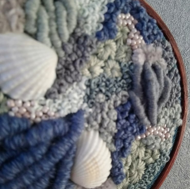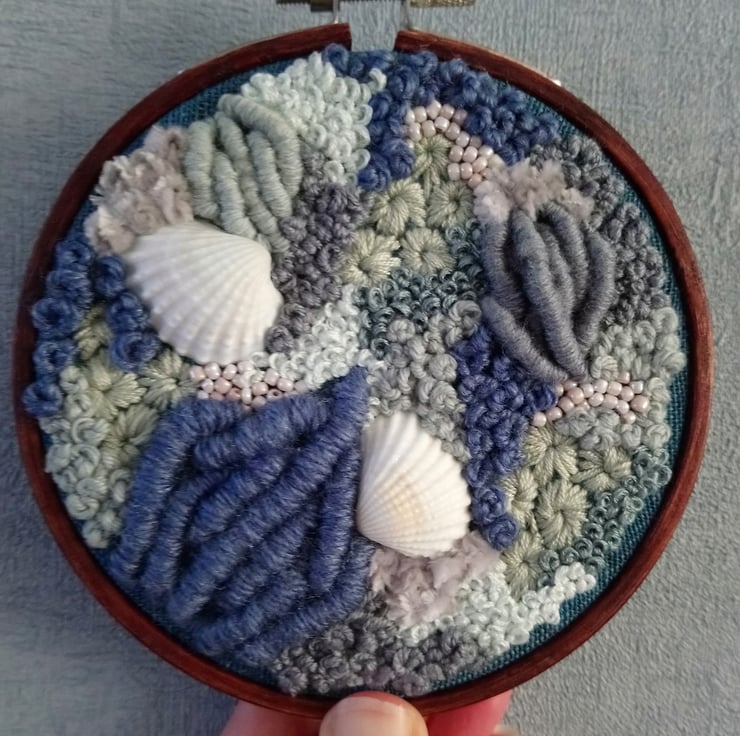 Sea kelp a 4 inch one of a kind hand embroidered home decor art piece. Embroidery thread, yarn, shells and beads have been hand sewn onto a blue fabric in an abstract pattern which has been placed in a cherry wood coloured hoop. This piece is a unique and eye catching addition to any home.