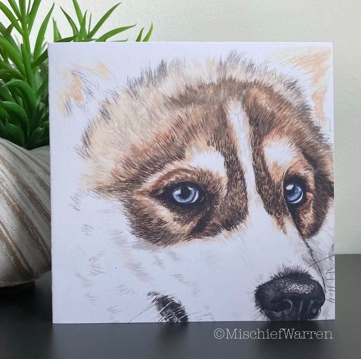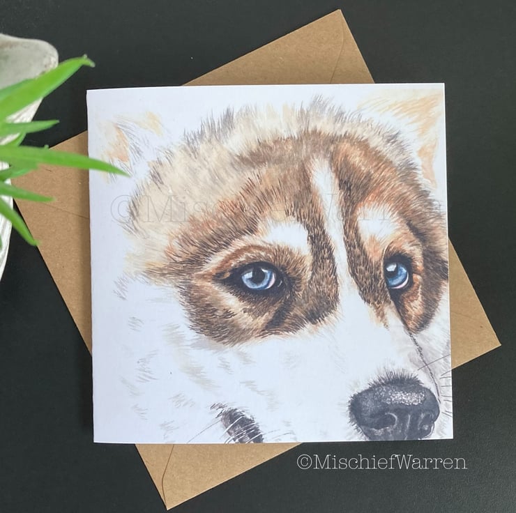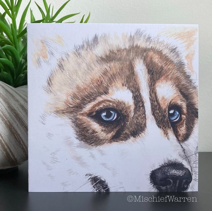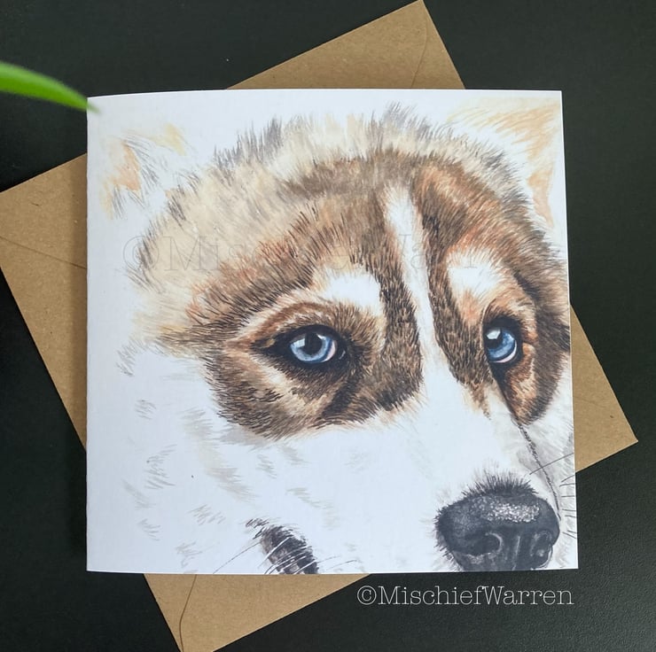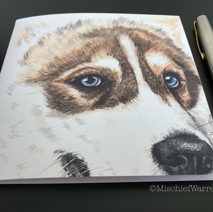 Designed, hand drawn, hand painted and printed by me. This card features a print of my ink and watercolour illustration of a German Shepherd or Alsatian dog. Can be personalised for any occasion; birthday, Easter, Valentine’s day, Mothers Day, Fathers Day, Thank you or Christmas perhaps. Blank inside, or I can add your message and/or send direct to the recipient.