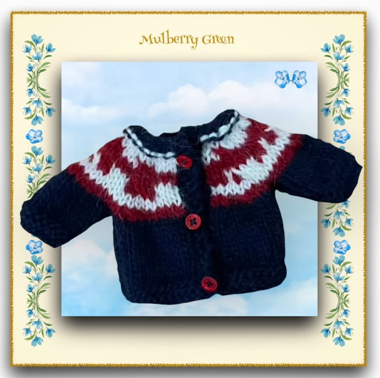 A lovely little navy blue cardigan, with a patterned yoke, to fit the Mulberry Green characters. The cardigan is hand knitted in pure Icelandic wool and is finished with three little red buttons.