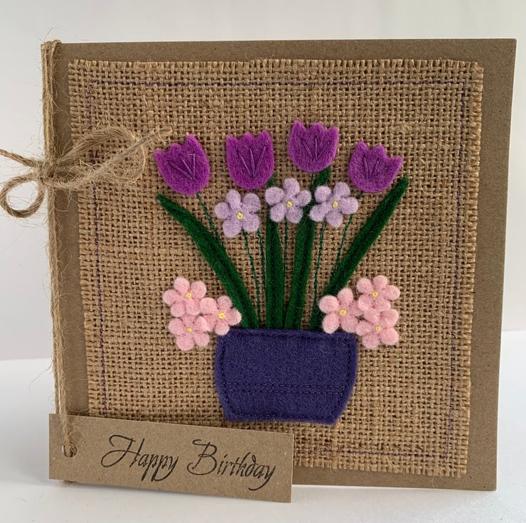 A handmade birthday card decorated with purple, lilac and pale pink flowers in a purple pot.