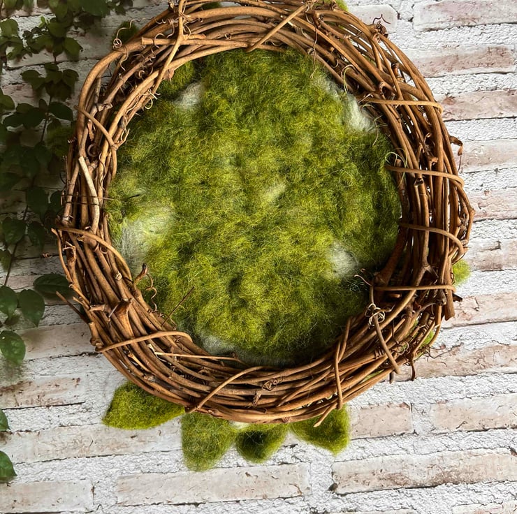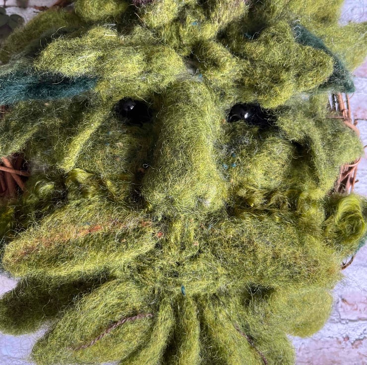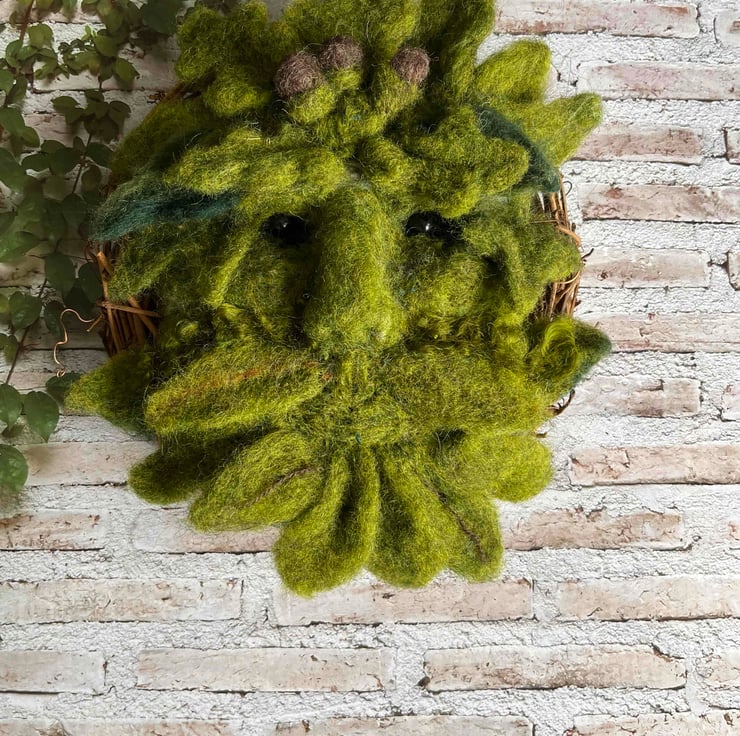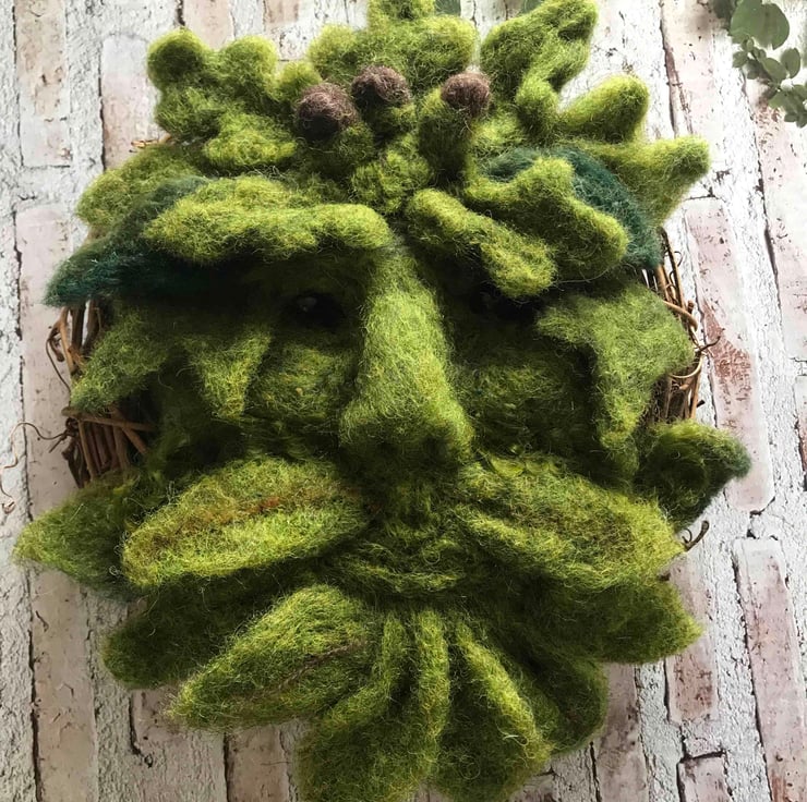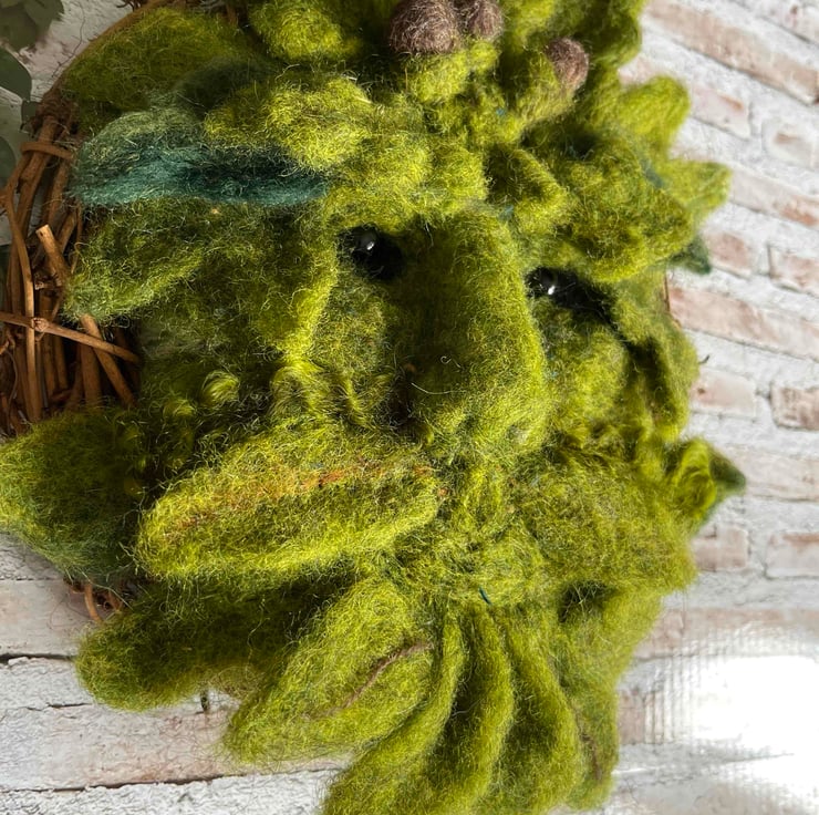 A rustic wreath is used to make the framework, and the green man is stitched onto it.