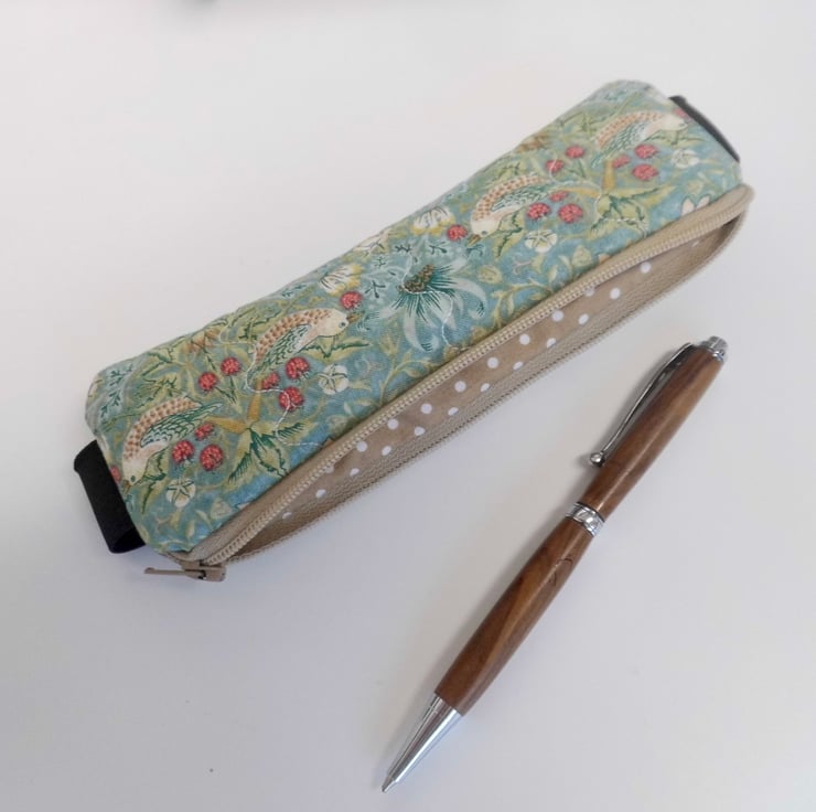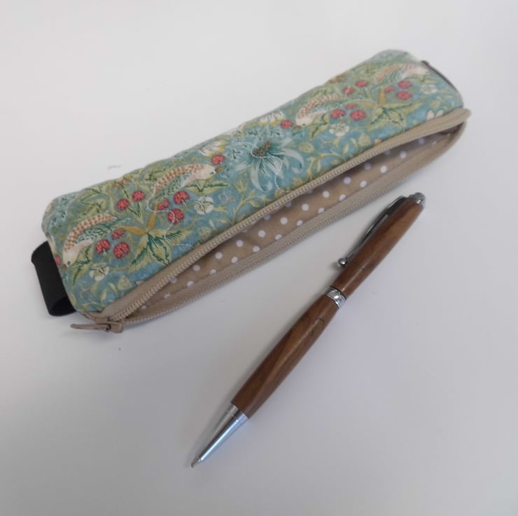 This one is made in William Morris' beautiful Strawberry Thief design fabric in a soft aqua green. Medium Weight Cotton. I backed the fabric with fusible quilter's wadding then machined three rows each side in wave stitch to achieve a lightly quilted effect. Lined with a coffee coloured spotted cotton.