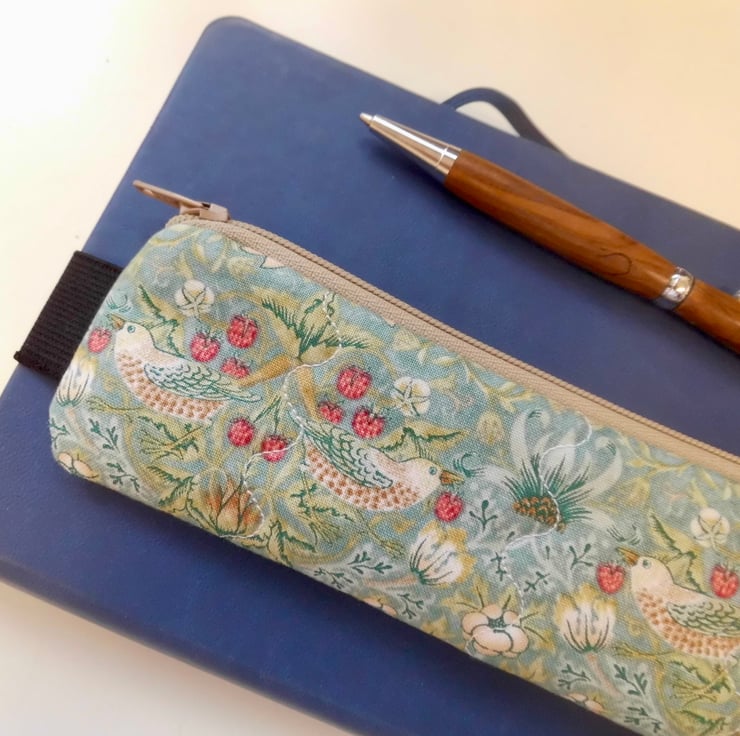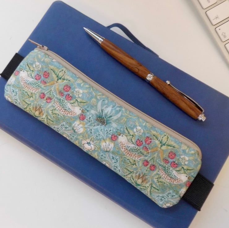A mini pencil case designed to be kept on the front cover of your diary or journal, held in place with an elastic strap. Just slip it on the front cover and you can always have a pen and pencil to hand. Add it to whichever notebook you are using for the day.