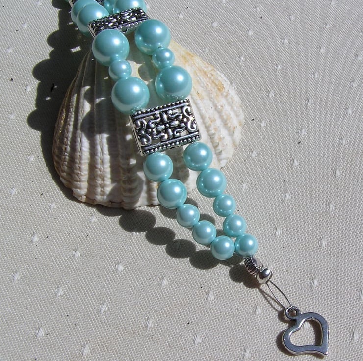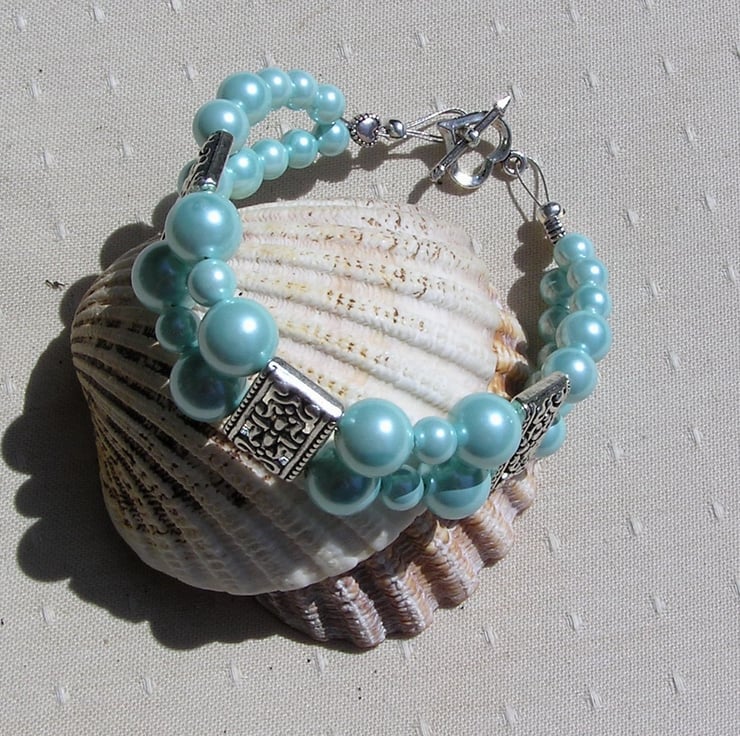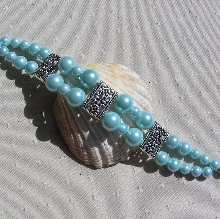 This Stunning Bracelet is made wholly from Turquoise Shell Pearls… in varying sizes of Round Beads (Shell Pearls are made from crushed shells which are then molded into shape and covered with a coloured coating)… each section separated by an ornately decorated Tibetan Silver Bar Spacer with a tiny Silver Heart at each end - a Beautiful combination that will look stunning either worn casually or with something more Elegant for a Special Evening out