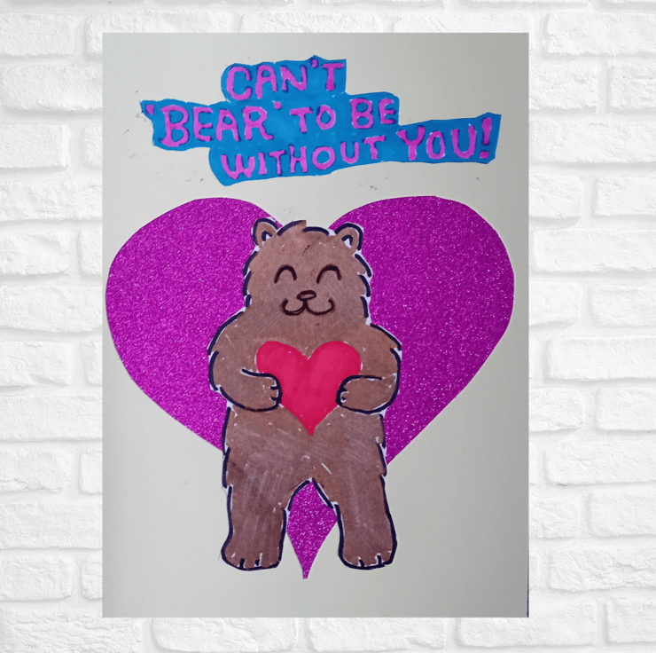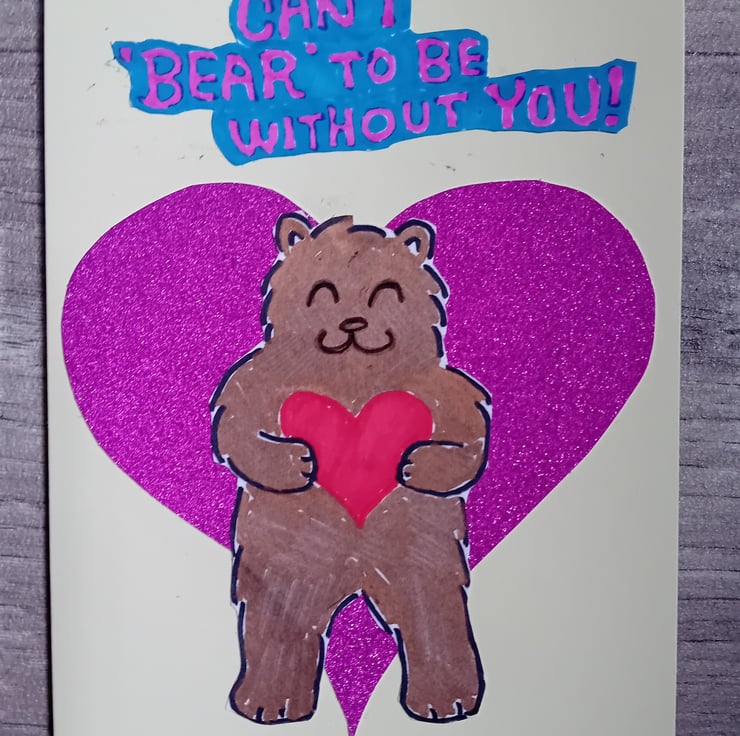 Charming handmade love cards showcasing a bear embracing a heart, accompanied by the sentiment: "Can't bear to be without you."