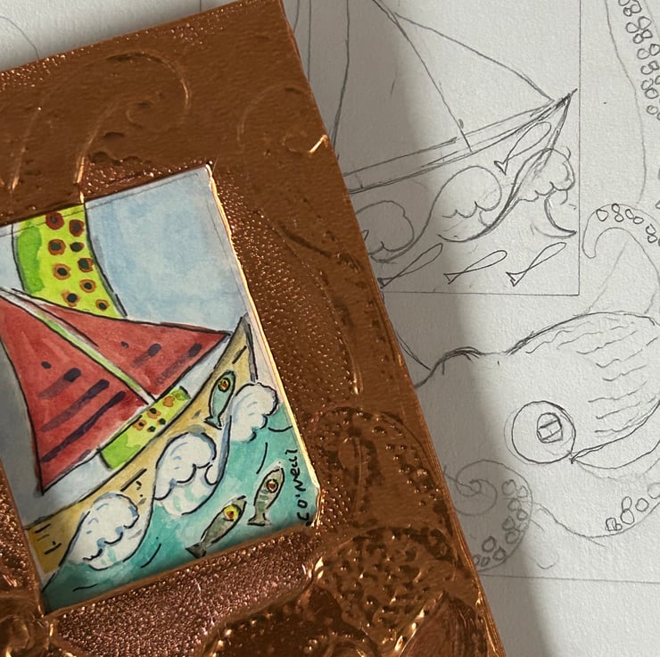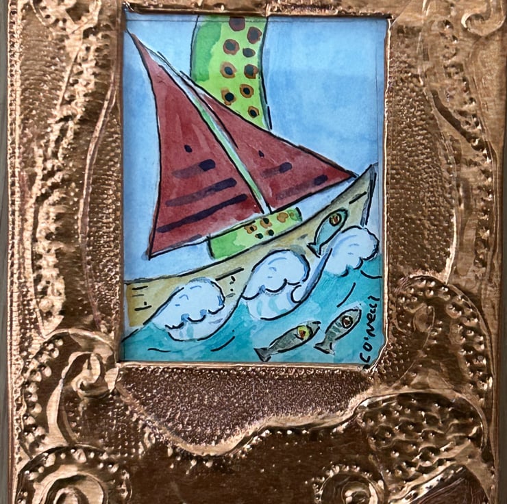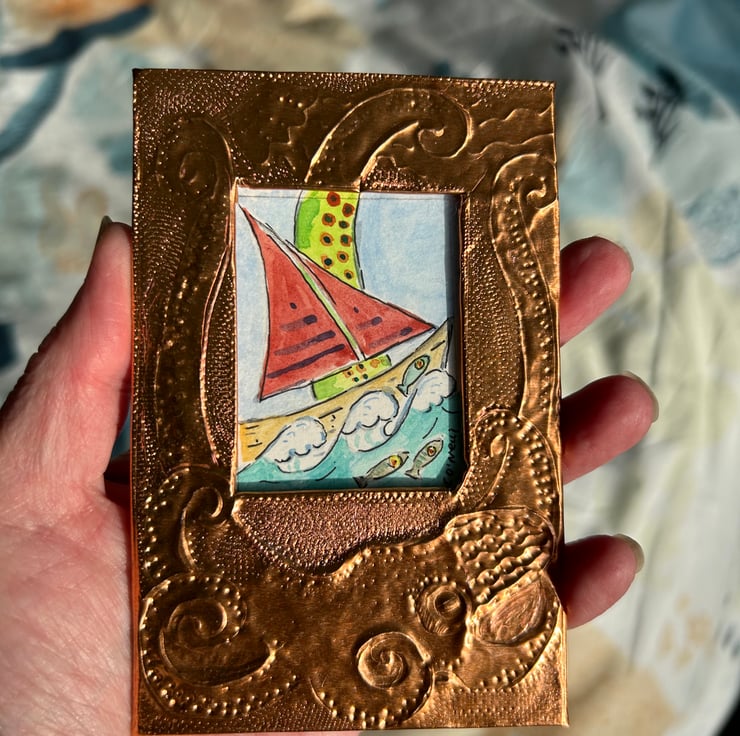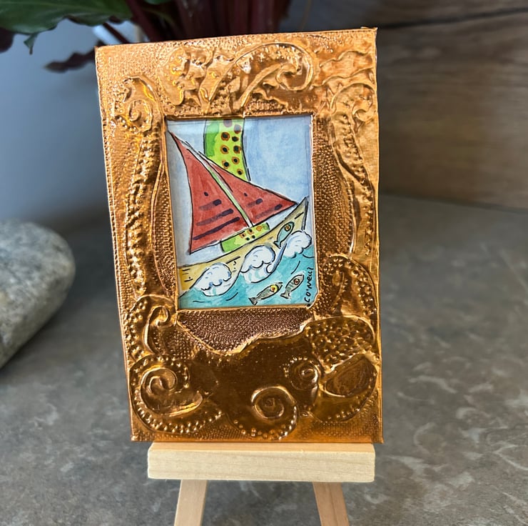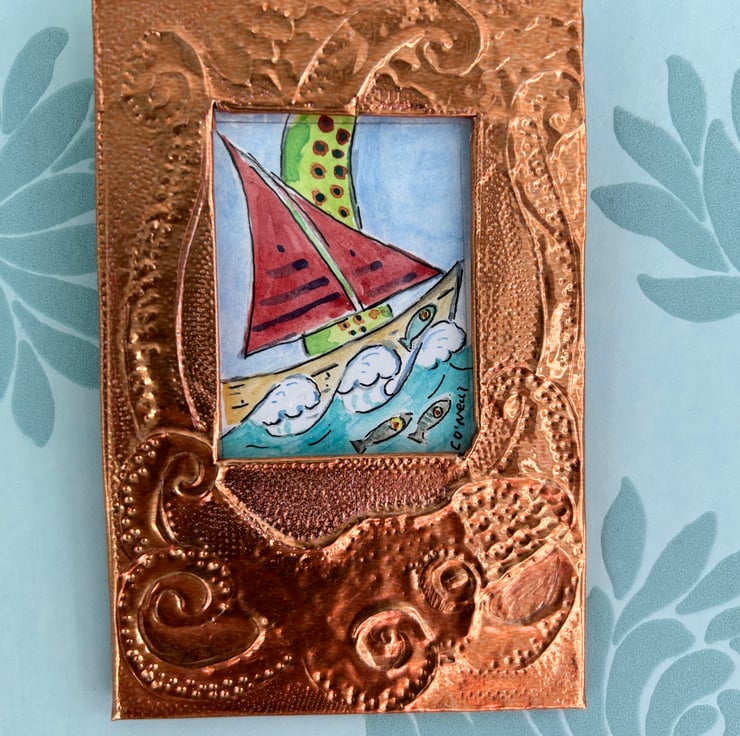 A small original painting of a sail boat out on the ocean waves. The frame is made with copper faced allumminium foil embossed to depict a giant octopus. The design continues through the watercolour with a tenticle reaching out behind the sail.