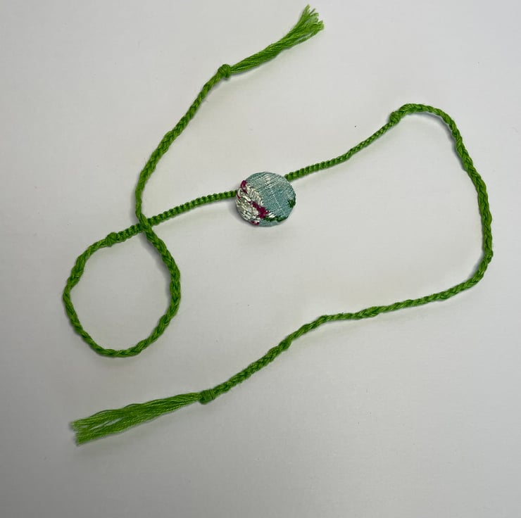 The button is hand covered in a hand embroidered silk fabric piece and the band has been hand woven, from a cotton yarn, using a plaiting and macrame technique.