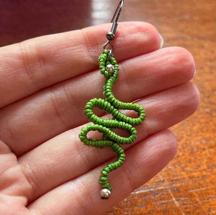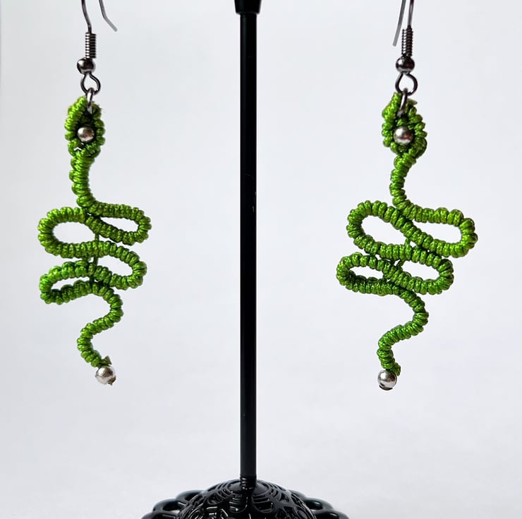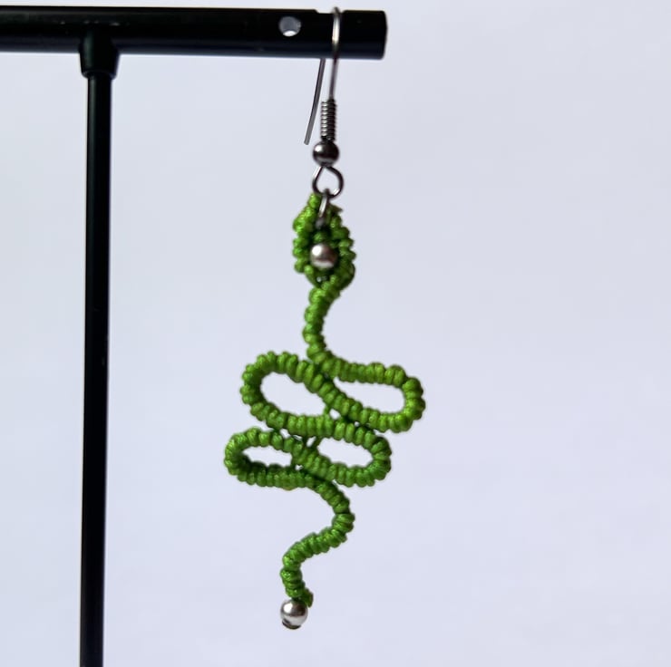 Macrame earrings are made using polyester cord and silver coloured beads and are attached to gunmetal grey earring hooks.